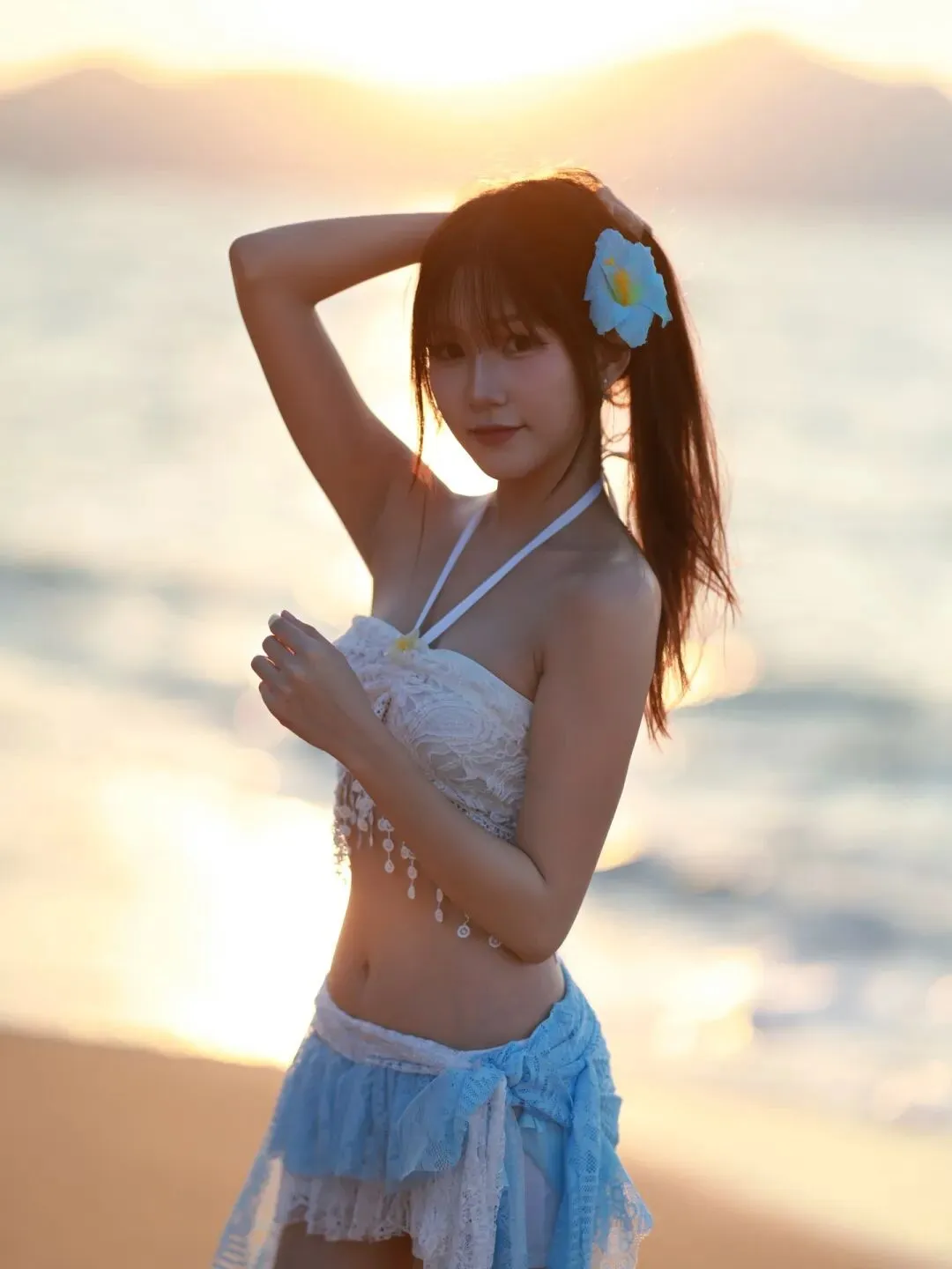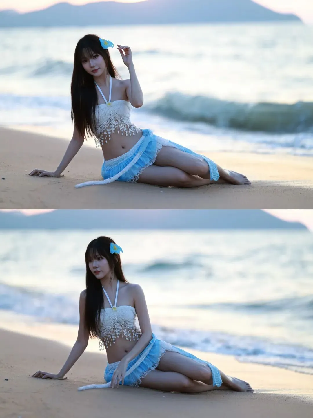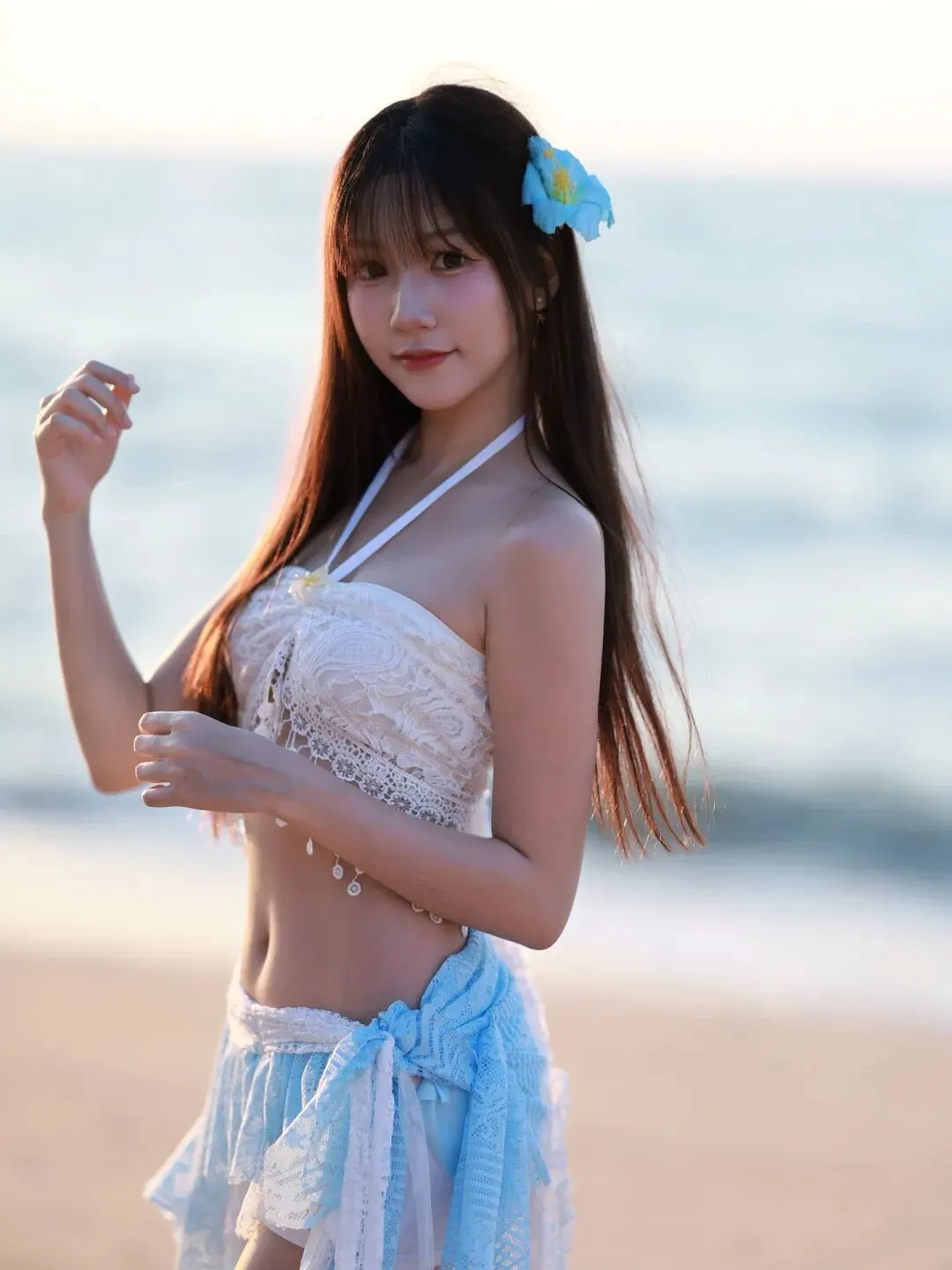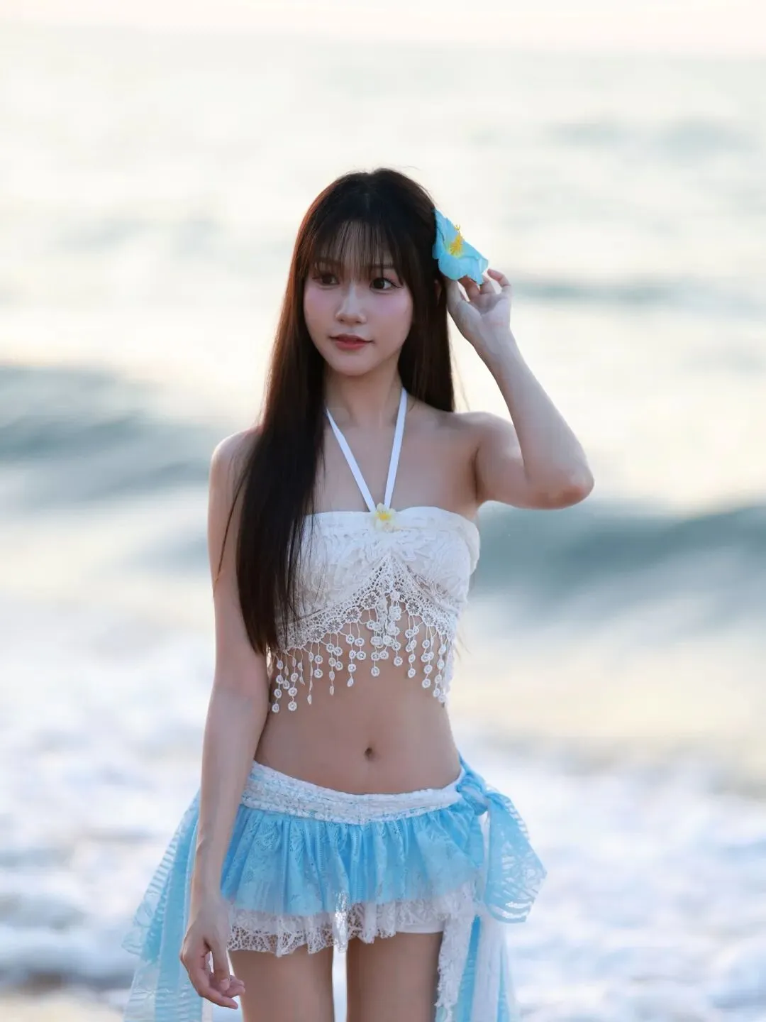 当前位置:首页>美女资讯>蕾丝泳衣邂逅海浪,蓝白纱裙少女在沙滩写下夏日恋曲