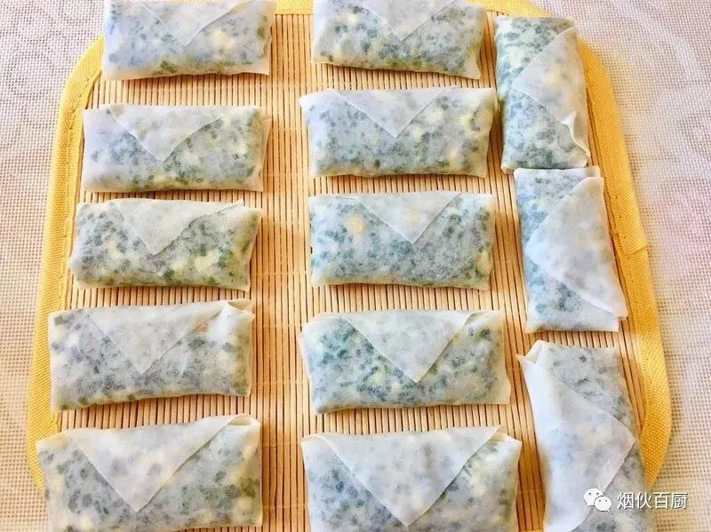 3、将所有的材料混合一起后搅拌均匀,把春卷皮放桌上铺平,然后将放入准备好的馅料,像叠被子那样把馅料给包起来,收口处沾水粘合就可以了;