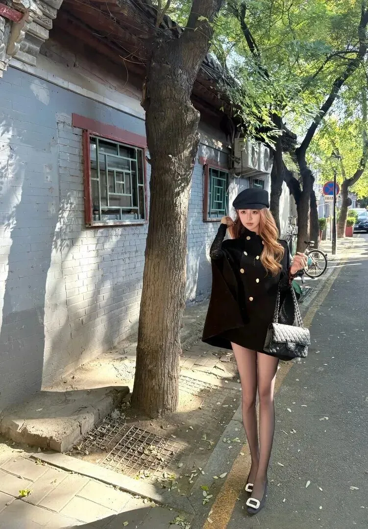 她戴着黑色贝雷帽,帽檐上一圈细金属边把整个整体的优雅感给提到了很高的位置。浅金色的长卷发随意地搭在肩头,发尾卷曲的弧度里带着几分法式的慵懒。笑起来的时候,眼睛像秋夜的星星一样亮晶晶的,很治愈。一件黑色的斗篷外套把身体包裹的严密,两个同样大小、形状相同,用金黄色做成的圆纽扣成为最主要的一点装饰,沉重的黑色一下子就变得轻盈起来。