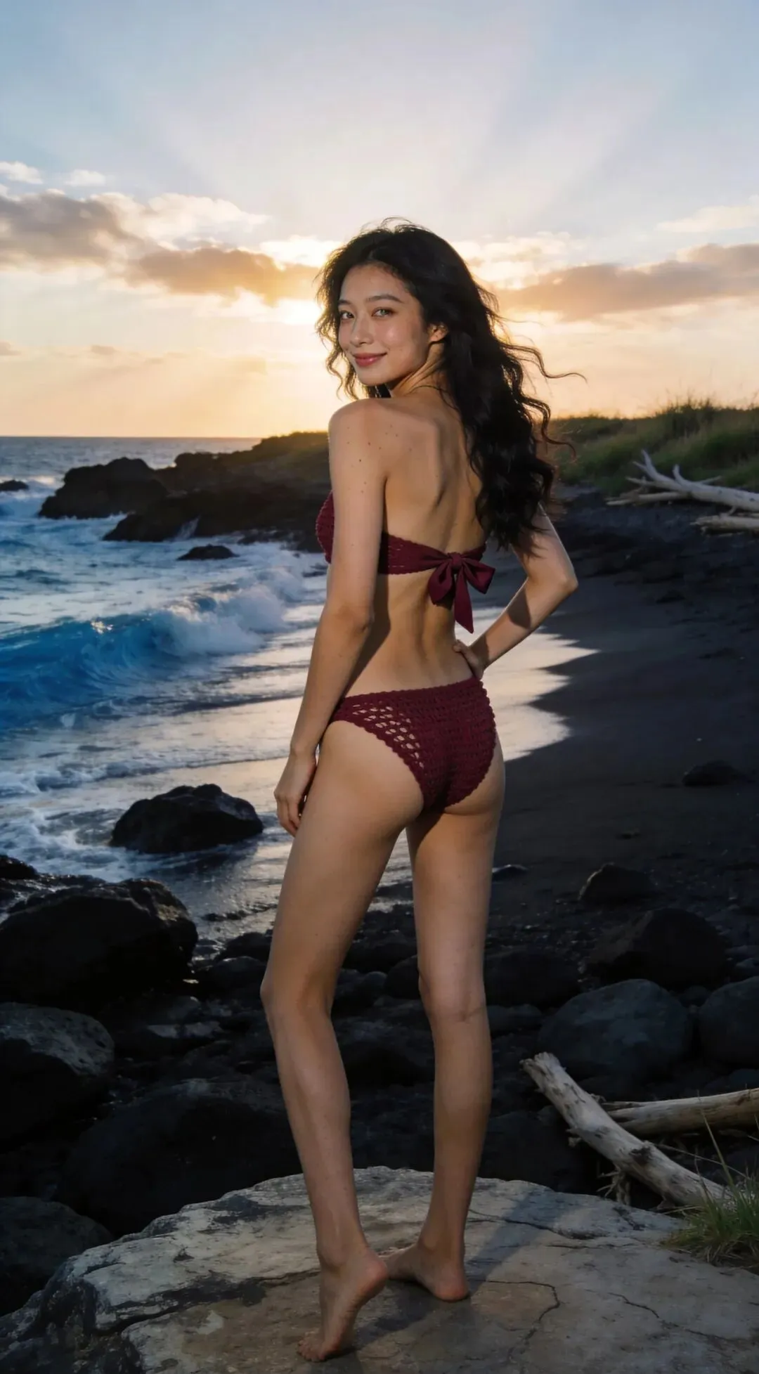 清冷骨感型身材的利落肩颈线条,在这件无多余设计的泳衣下被完美展现,利落的肩线与泳衣的简洁版型相得益彰。纤细腰肢被高弹面料轻轻包裹,勾勒出恰到好处的曲线,不会过于紧绷也不会松弛。修长四肢在酒红色的映衬下更显纤细修长,文艺气质与泳衣的沉静色调相互融合,每一个转身都自带故事感,将清冷与温柔平衡得恰到好处。