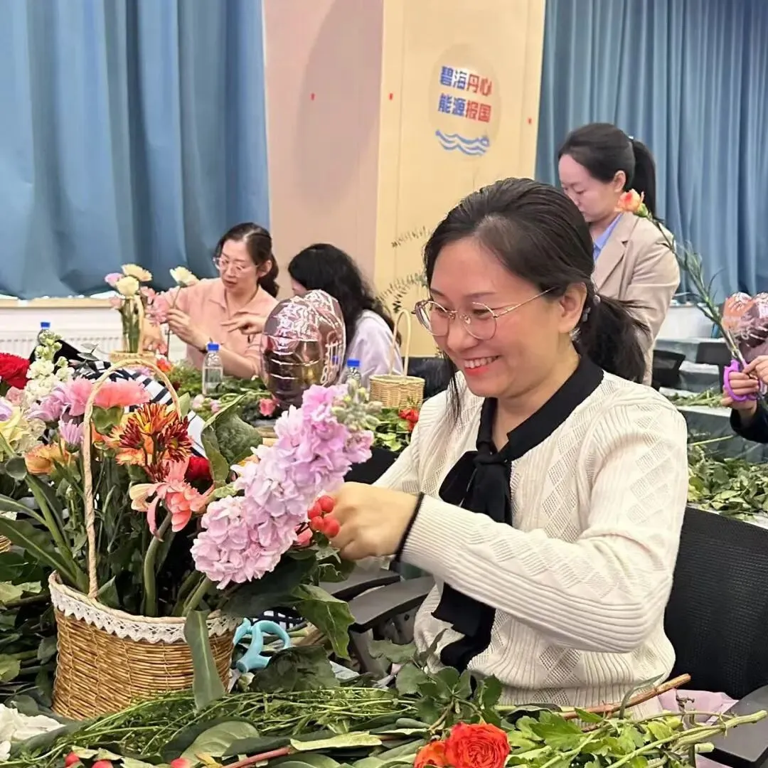 花艺体验沙龙活动中,女职工们兴致盎然,在花艺师的指导下变身妙手花匠,发挥创意,精心构思,将一朵朵鲜花错落有致地搭配在一起,通过修剪、整枝,打造着自己心中的“伊甸园”。
