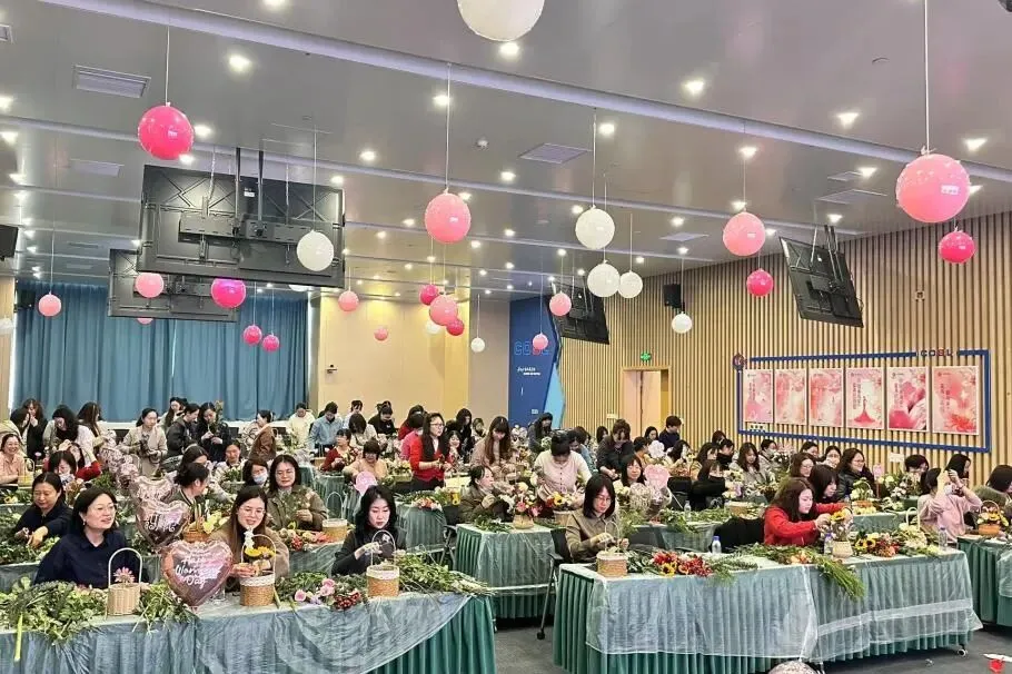 公司燕郊片区组织开展“扬巾帼风采  创时代光辉”女神节活动,邀请300余名女职工开展干花相框DIY、插画DIY、簪花制作、养生艾草锤制作等手工趣味活动。