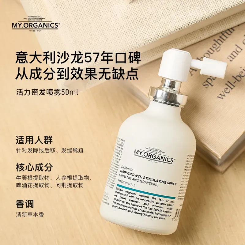 下面是广告时间啦:春天到,温差变化和人体新陈代谢加速会导致脱发加快,头皮毛囊进入休止期的比例增加,所以春季是一个掉发的季节。今天给大家安利一款防脱神器——意大利有机洗护品牌MY.ORGANICS的活力密发喷雾,对抗春季脱发。