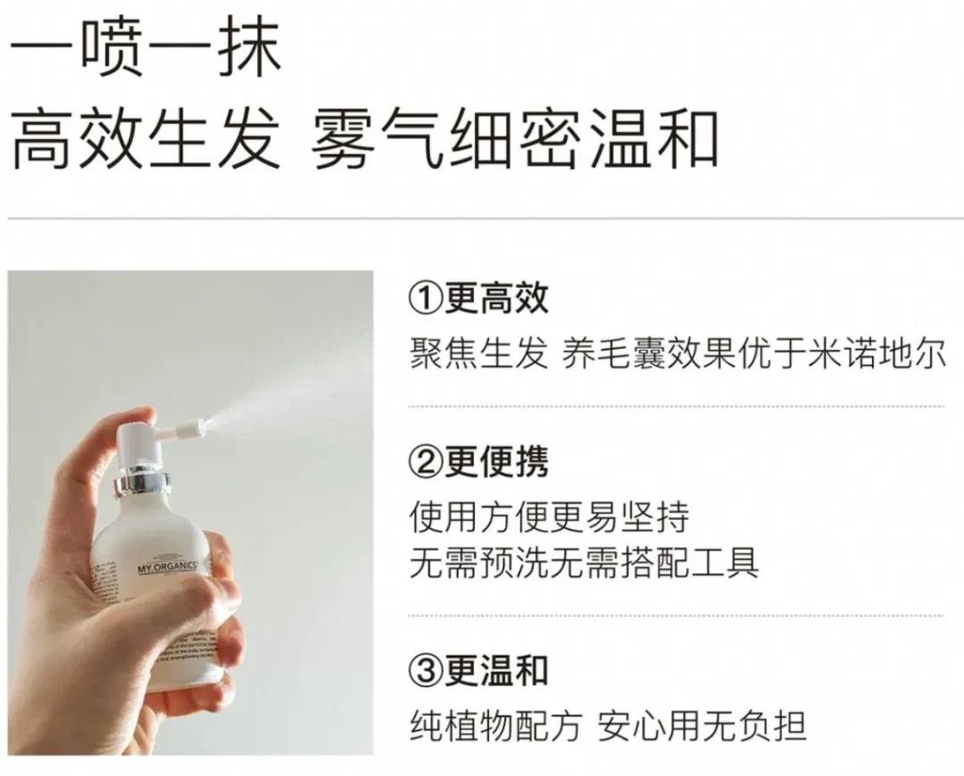 MY.ORGANICS活力密发喷雾主打一个毛囊逆生长,倍速提升发量感,养毛囊效果优于米诺地尔。