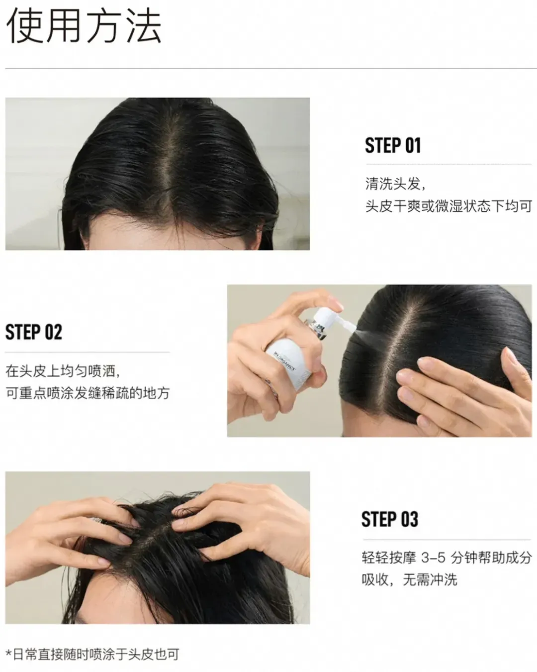 喷出来是水雾状,细腻均匀,不会搞脏面部和衣服,直接在头皮上均匀喷洒,重点喷在发缝稀疏的地方,然后轻轻按摩3-5分钟,无需冲洗。