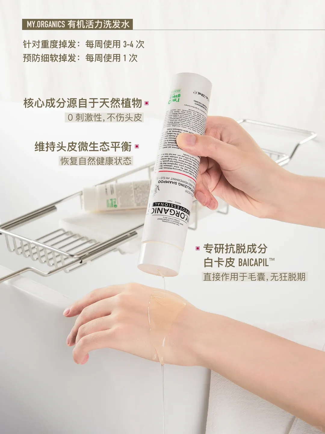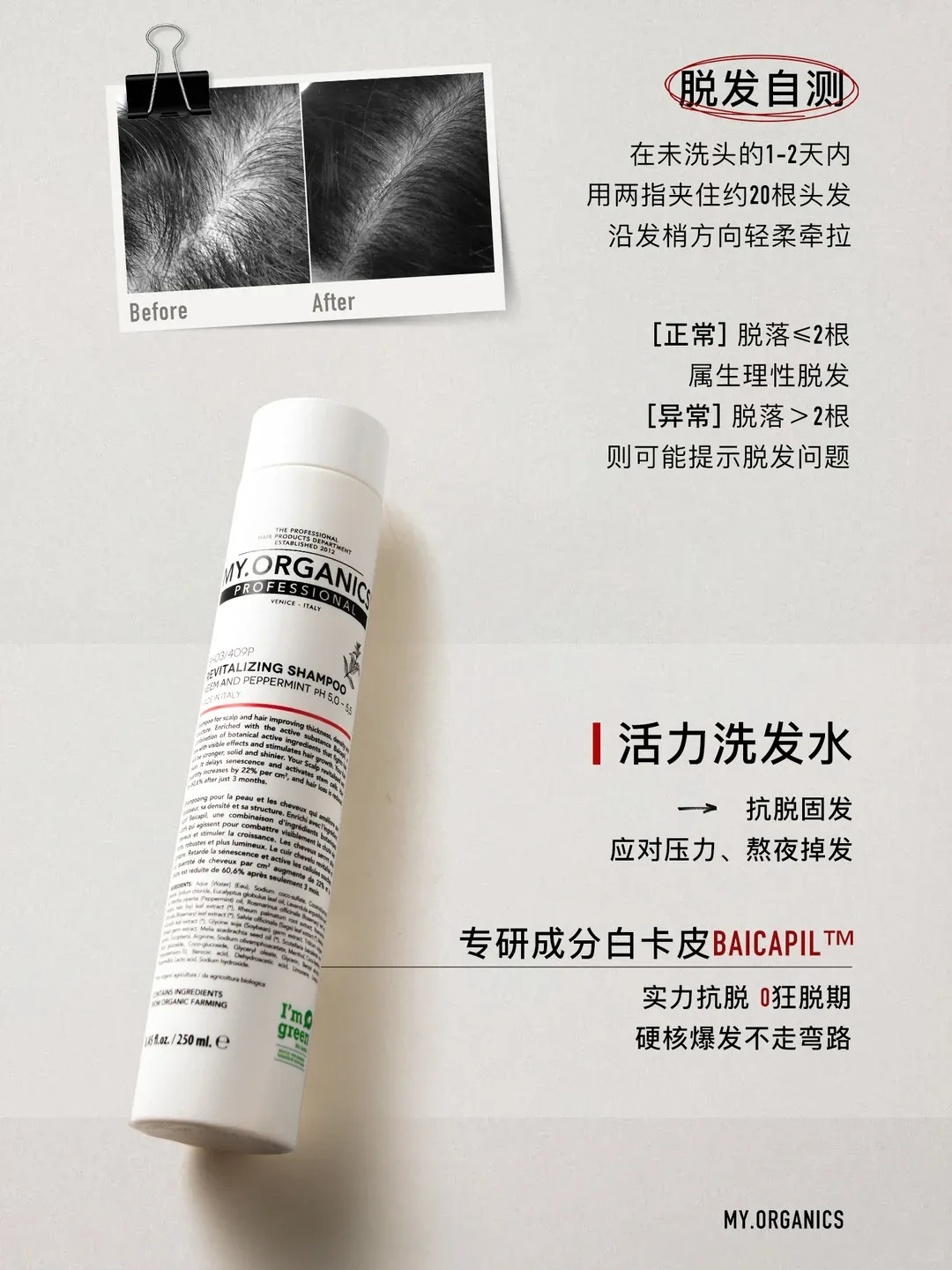 除了活力密发喷雾,MY.ORGANICS白瓶有机活力洗发水,主要功效也是防脱。成分是BAICAPIL™(专利活性成分),由黄芩、小麦、野大豆组合而成,预防毛囊早衰,稳固发根,头发就不容易掉啦。