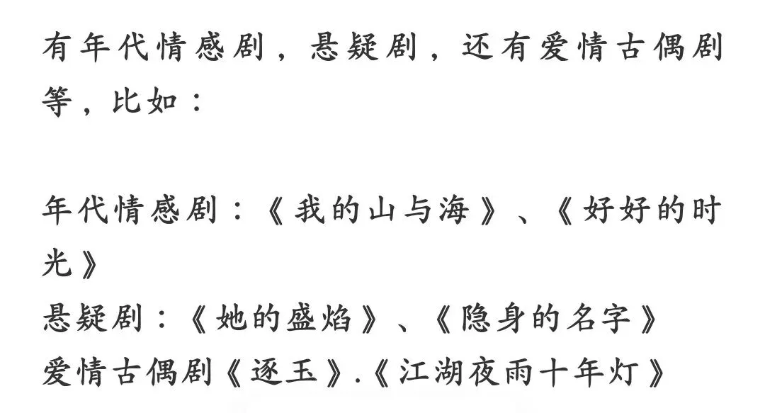 有年代情感剧,悬疑剧,还有爱情古偶剧等,比如: