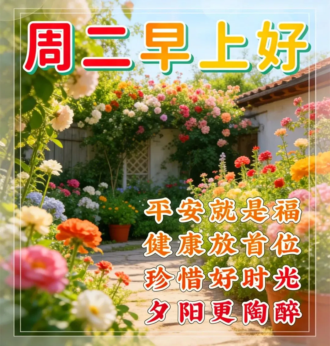 13.美好的祝福在早上,只要心情舒畅,山水依旧风光;只要身体健康,风景总在前方;只要童心不老,永远活得漂亮,周二早上好!