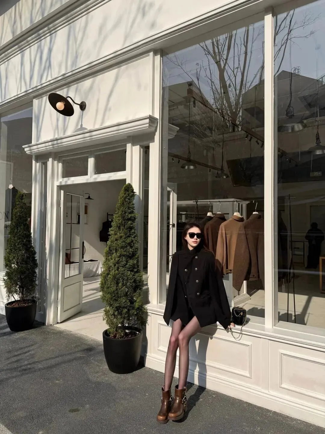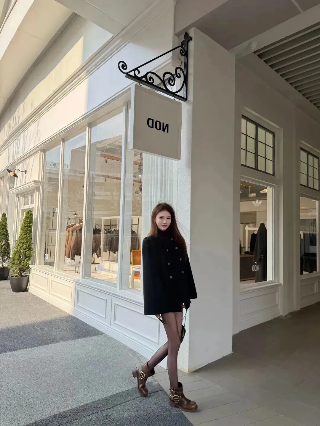 首先看这套装件短款大衣。黑色双排扣毛呢外套长度正好卡在大腿中间位置,自然地暴露了腿的线条轮廓,立刻把人增高了五公分。小姐姐穿了超薄透肤丝袜,肌肤质感被打破,冬天的沉闷气息不见了。脚上那一双深棕色短靴就显得特别得体,在做旧皮质的基础上再加上金属扣饰,古色古香又不失时髦感。斜挎的链条包,步伐微微一动就有了一种小的俏皮感觉,但是却有着一种摩登的味道。