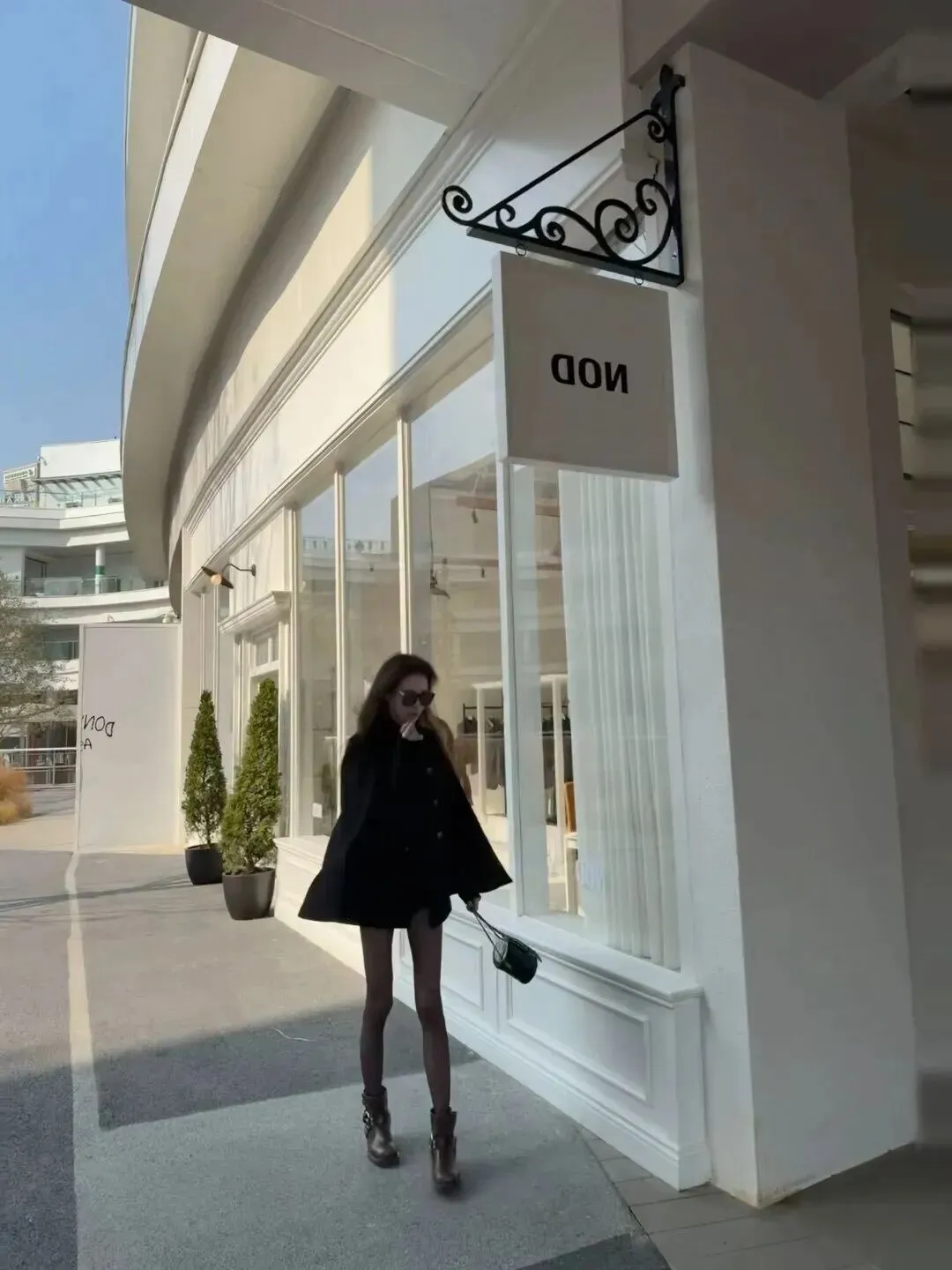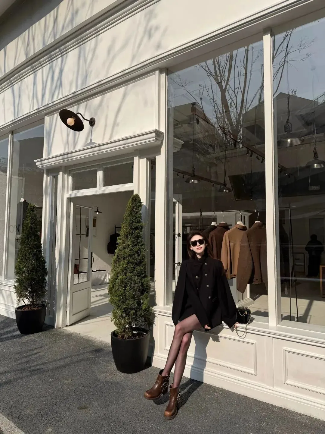 最后这套街头风的穿搭简直是帅到无友。短款毛呢大衣加上黑色丝袜,走路时带着风的气场。深棕色短靴加深绿的手提包撞色,一下子把全黑的单调给打破出来了。小女孩戴着墨镜抬手轻点嘴唇时,那种随意又带点儿酷劲儿的样子,就是都市酷女孩儿的代表。这样的一身穿搭超方便出门穿着,既保暖又时尚,哪位穿哪位美。