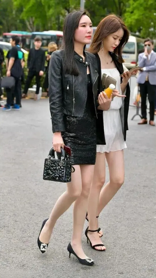 背影也可以如此生动地刻画出来,在左图中左边为西装外套配白裙的少女,下摆飘起更显灵动。右边是皮衣加渐变亮片裙,从后面看线条非常流畅。两位的人字结凉鞋、尖头高跟鞋各不相同。所以穿搭的细节不能忽略。