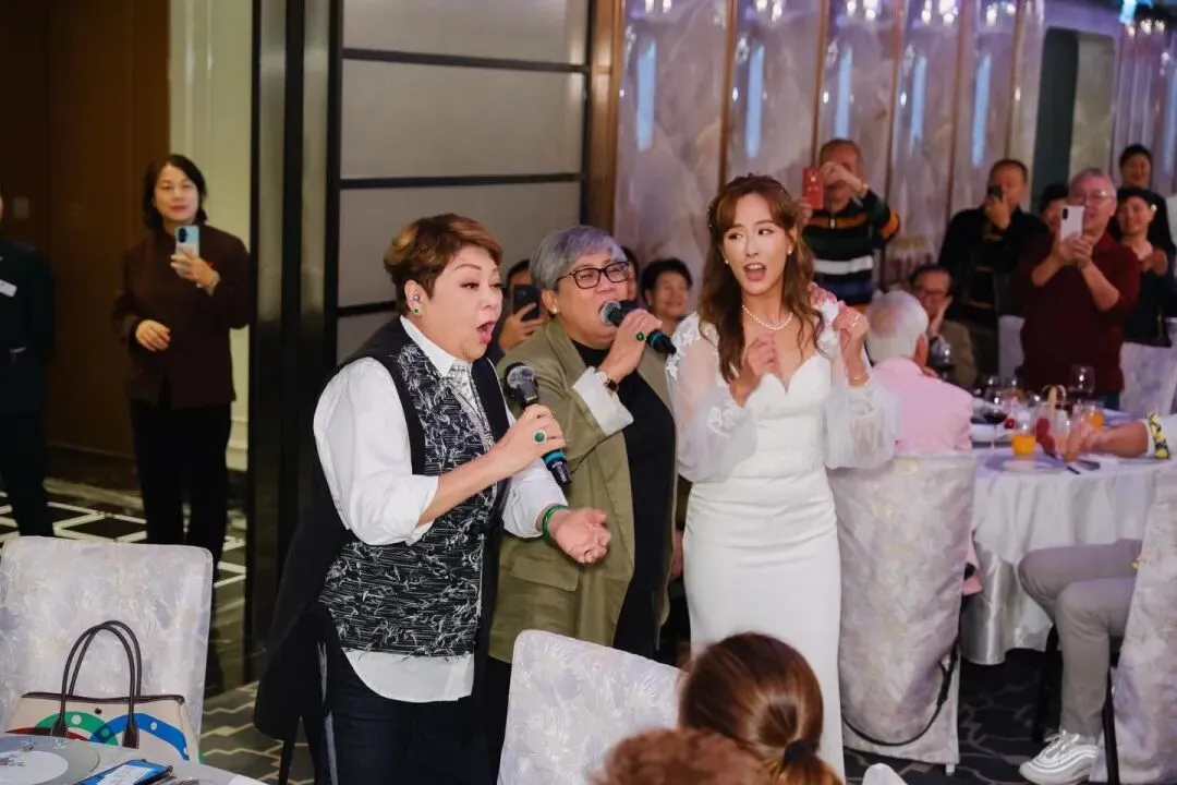 此次婚礼星光熠熠。谢伟俊担任证婚律师,李龙基、谭玉瑛、郑世豪、李思捷等大批圈中好友到场祝贺。肥妈与李丽霞更是现场献唱,热闹氛围宛如迷你演唱会,足见吴幸美在圈内的好人缘。