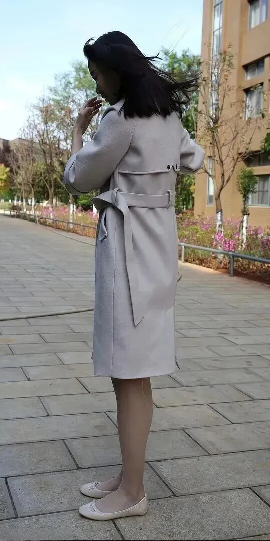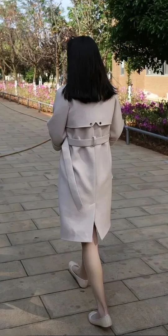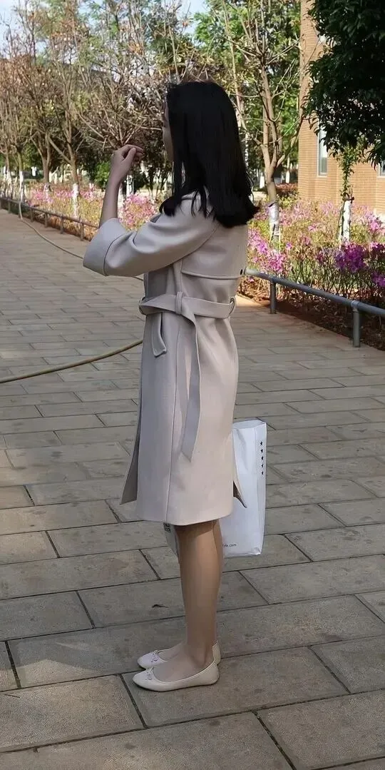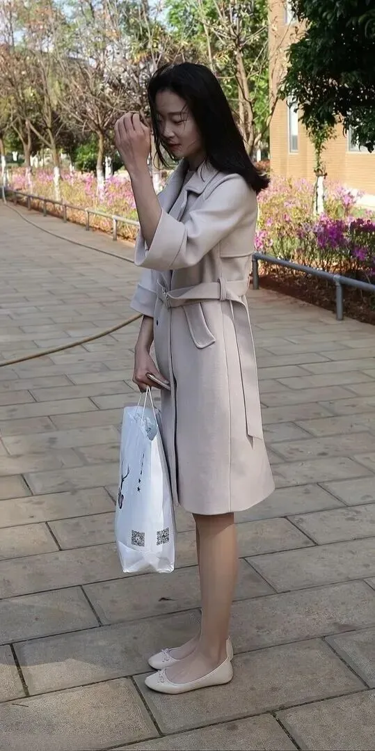 大衣就是这套穿搭的灵魂。中长款设计加系带腰带穿上以后特别显身材。面料摸起来应该很舒服,垂感好,走路时带点飘逸。七分袖只露出小臂,不会太胖。腰带尾部自然下垂,简单大方。