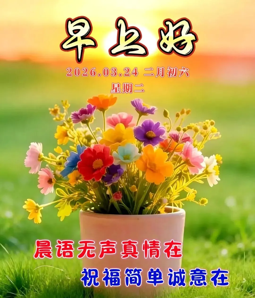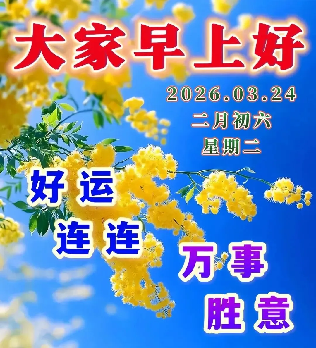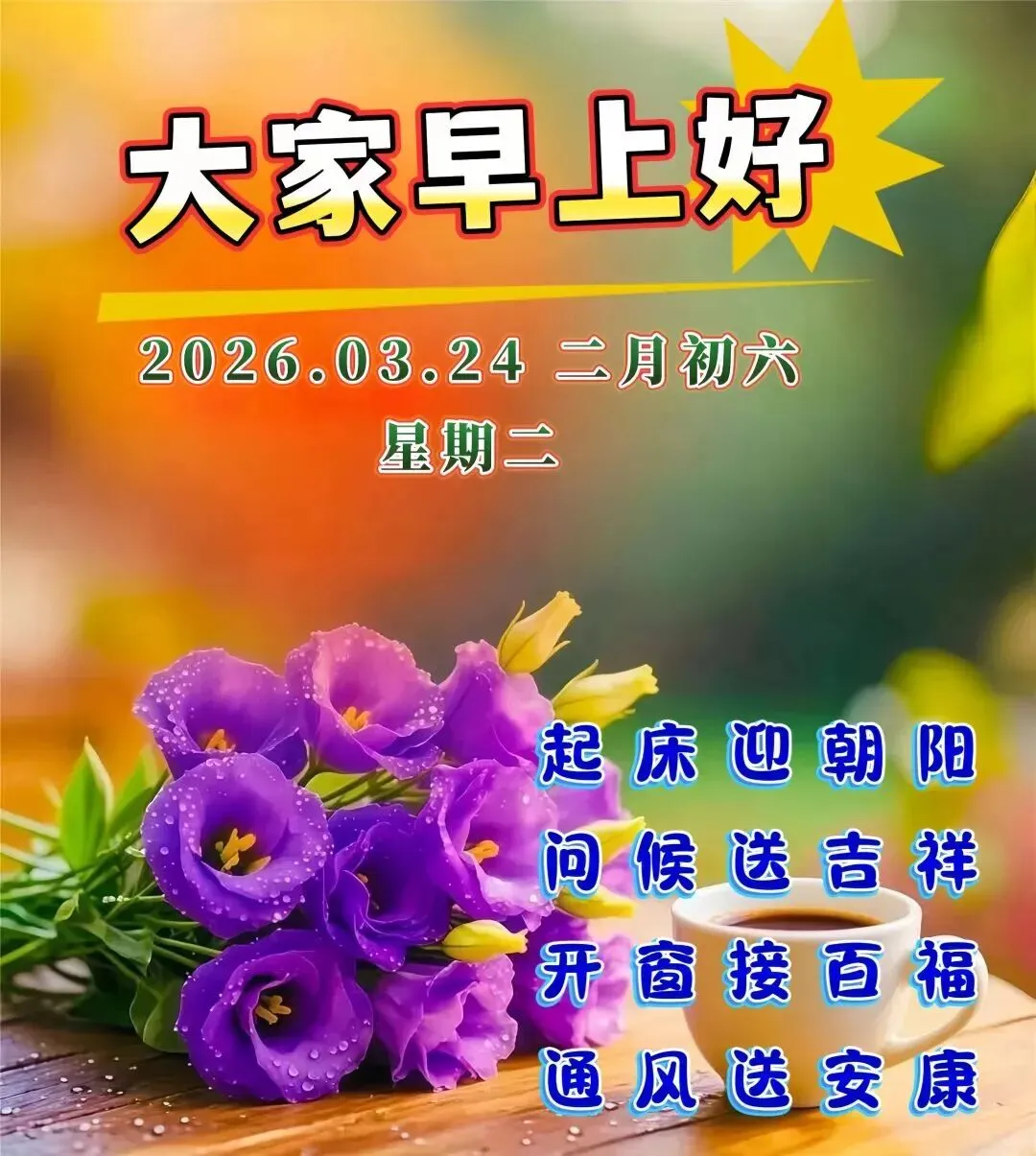 今天是3月24日,☀️清晨醒来喜洋洋,🌷朋友福气绕身旁,💕眼前的路好运映照,🌸幸福人生处处光芒,🌹祝福你每天开心,🌻平安如意一天又一天!🌞早安吉祥!🌅