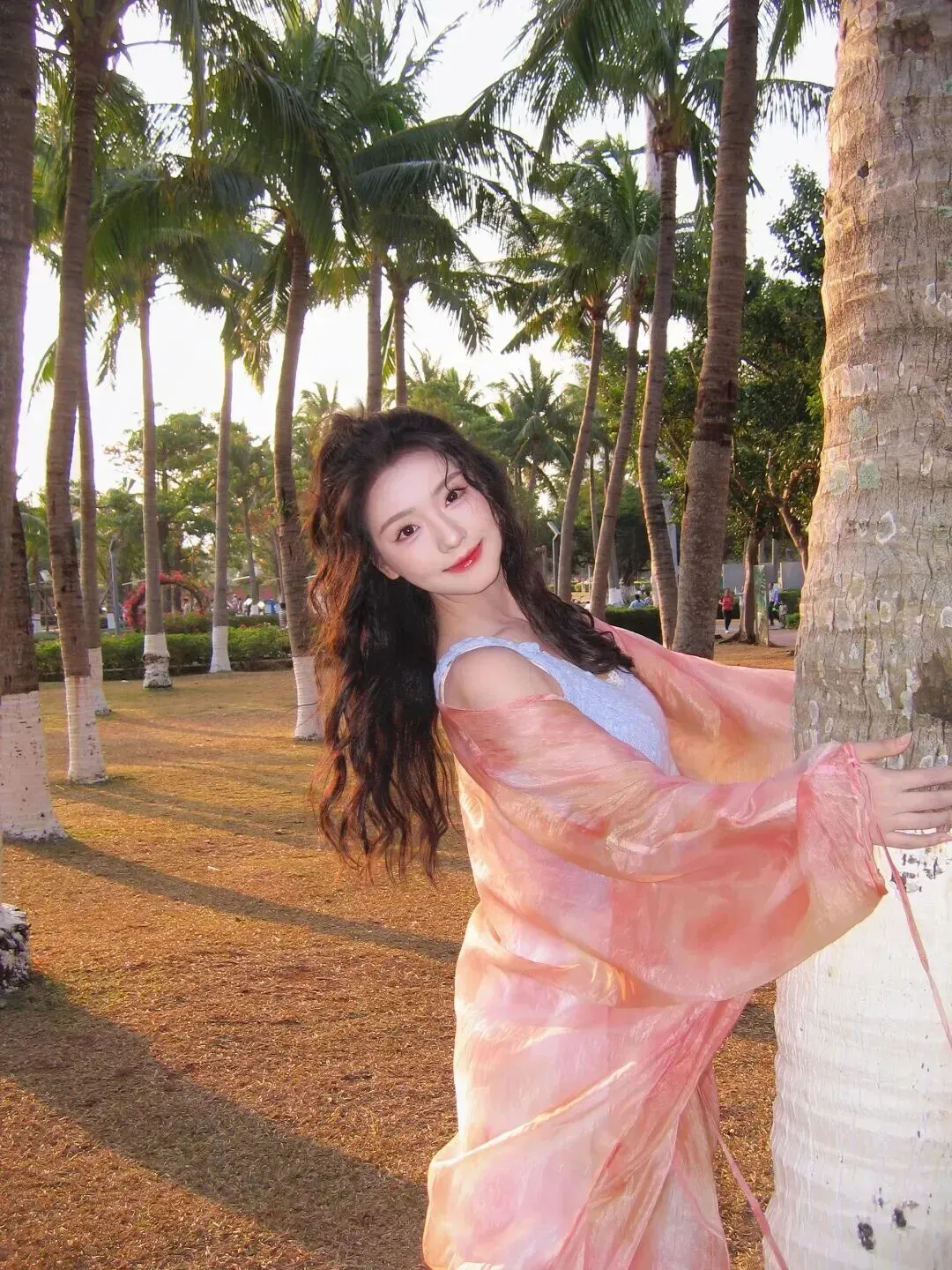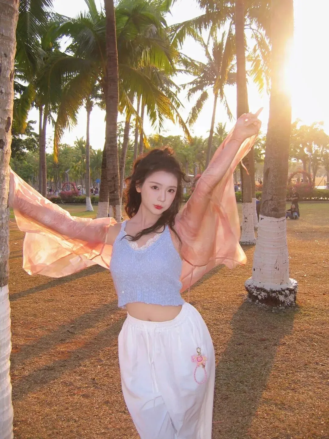 草坪上她笑得更开了,灰蓝色吊带配白色长裤,清爽得很像海风。头发盘起后成了高马尾,暴露出来的耳朵部薄纱飘扬,带有度假气息的棕榈树与遮阳伞将画面装饰了起来。这身简单又上镜,适合拍照发朋友圈,随便加个滤镜都美翻天。