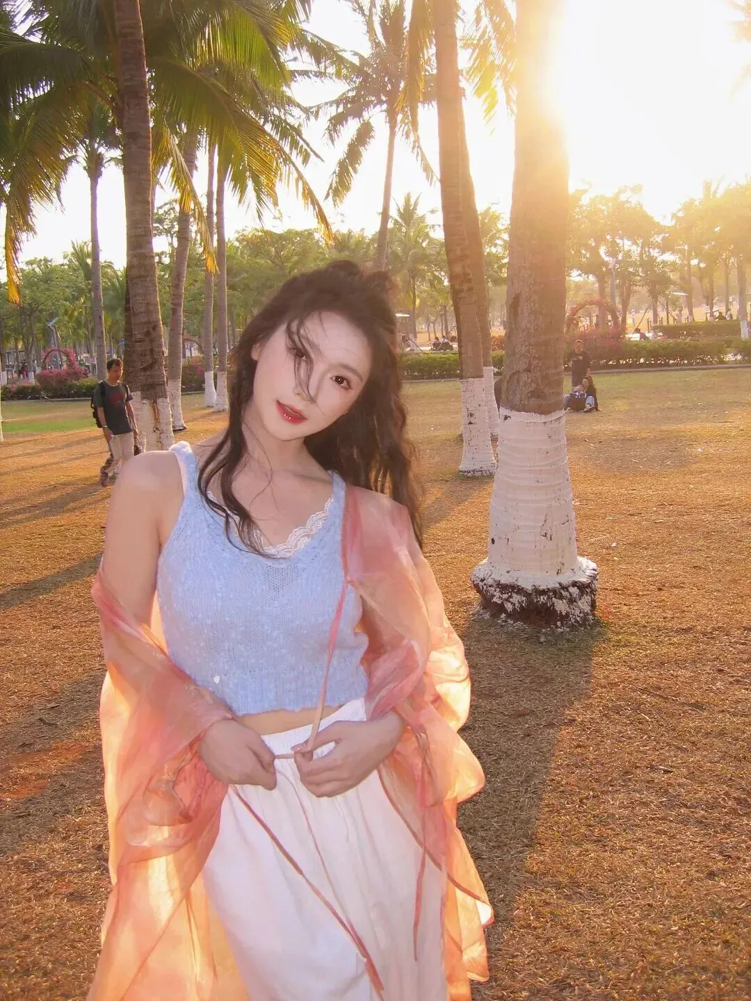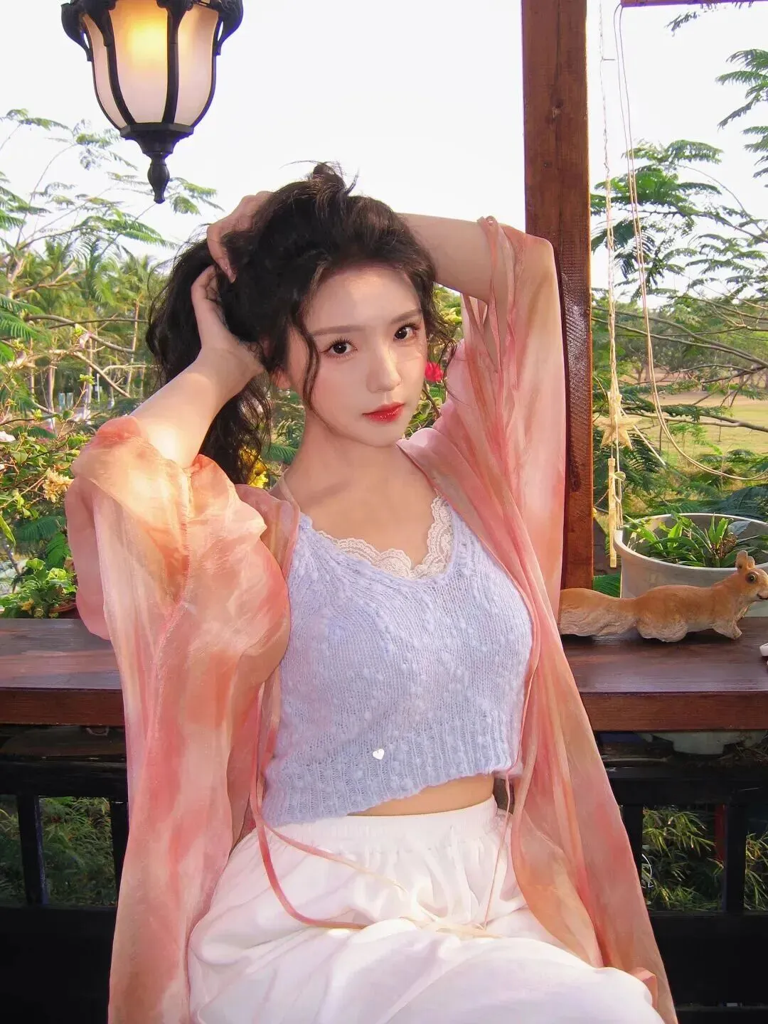 转至庭院这边就穿上了一件短款吊带上搭阔腿裤的款型,活泼泼的一样。吊带来口是精致的蕾丝边,米白色裤腿宽松,走路时风飘飘。外套上淡淡的粉色轻薄毛料开衫摆动着,蓬松多样的头发又变得更加可爱。当时我就觉得这打扮很适合周末约会,随便一拍就是韩剧女主范儿。