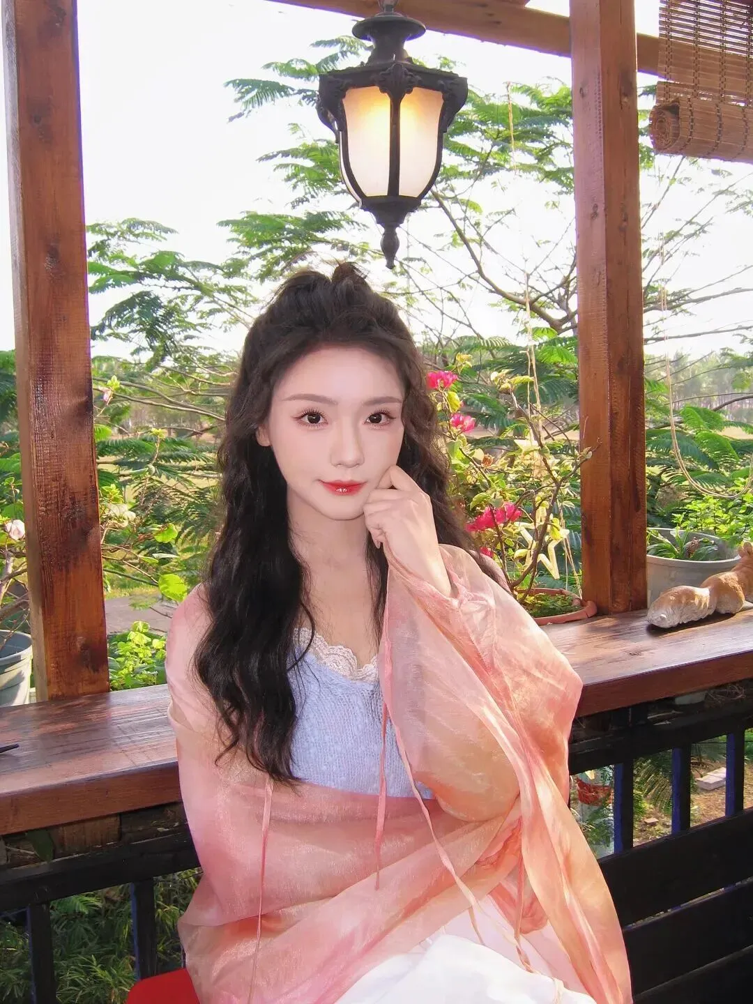 在木质廊架的下面是柔和的光线,所以她坐在红垫子上就安静了许多。半扎头发显得温婉动人,灰蓝色的吊带上色和粉色橘色的罩衫组合在一起颜色很协调。阳光透过树叶缝隙照在了身边一个人身上,他似乎成了油画里的一位佳人一样静静地站立在那里,散发着一种美。