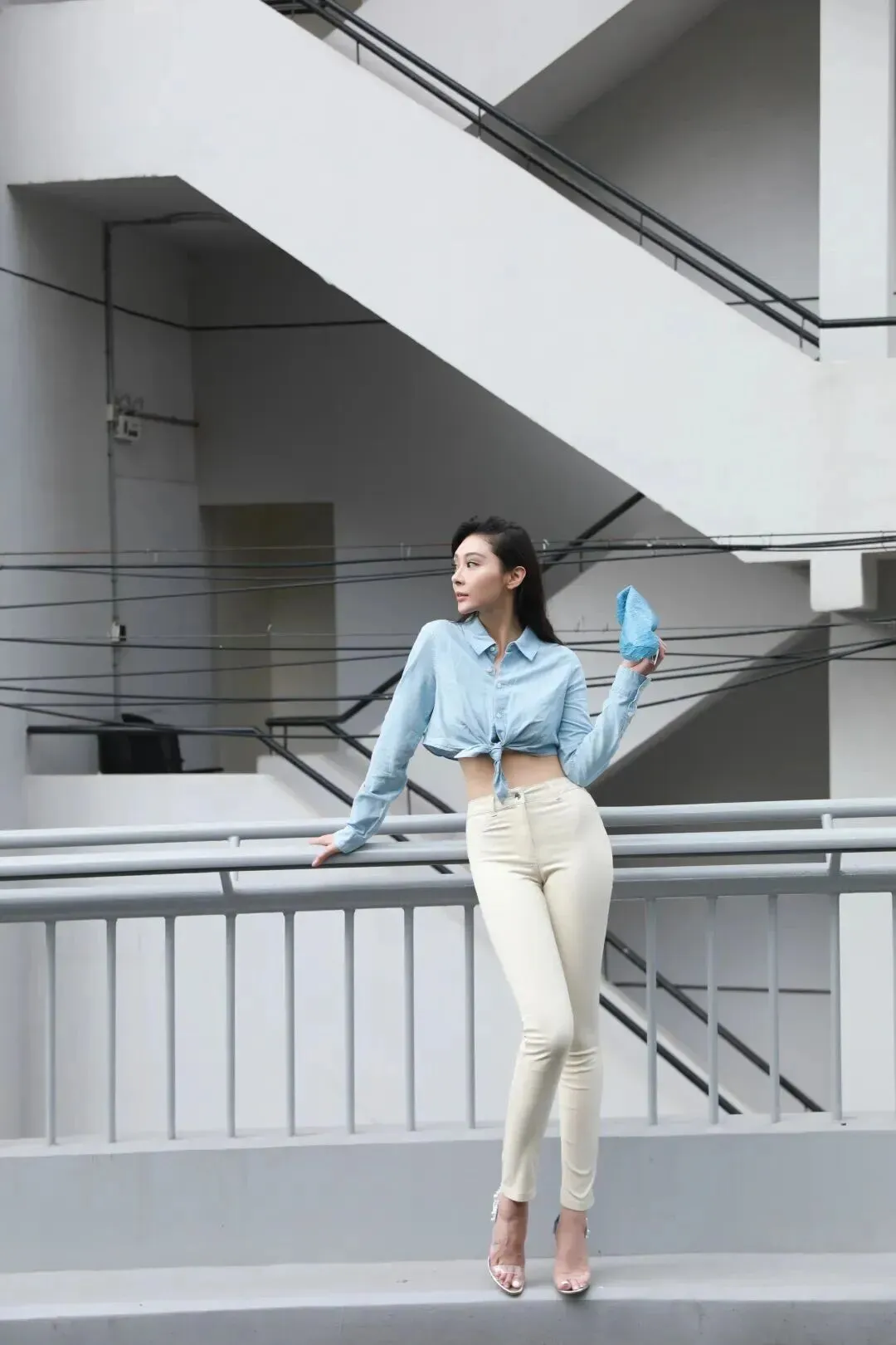 全身镜头时她的衬衫选用的是牛仔质感的浅蓝、高腰紧身牛仔裤、穿小凉鞋并带少许银色,高挑苗条身材在光影下更加显现出她的线条美和优雅风。她走在现代建筑的步道上,笑得十分甜美、动作活泼地把清新时尚的气质完全地表现出来。这套衣服上班穿不会太随意,出去玩又足够亮眼,实用性满分。