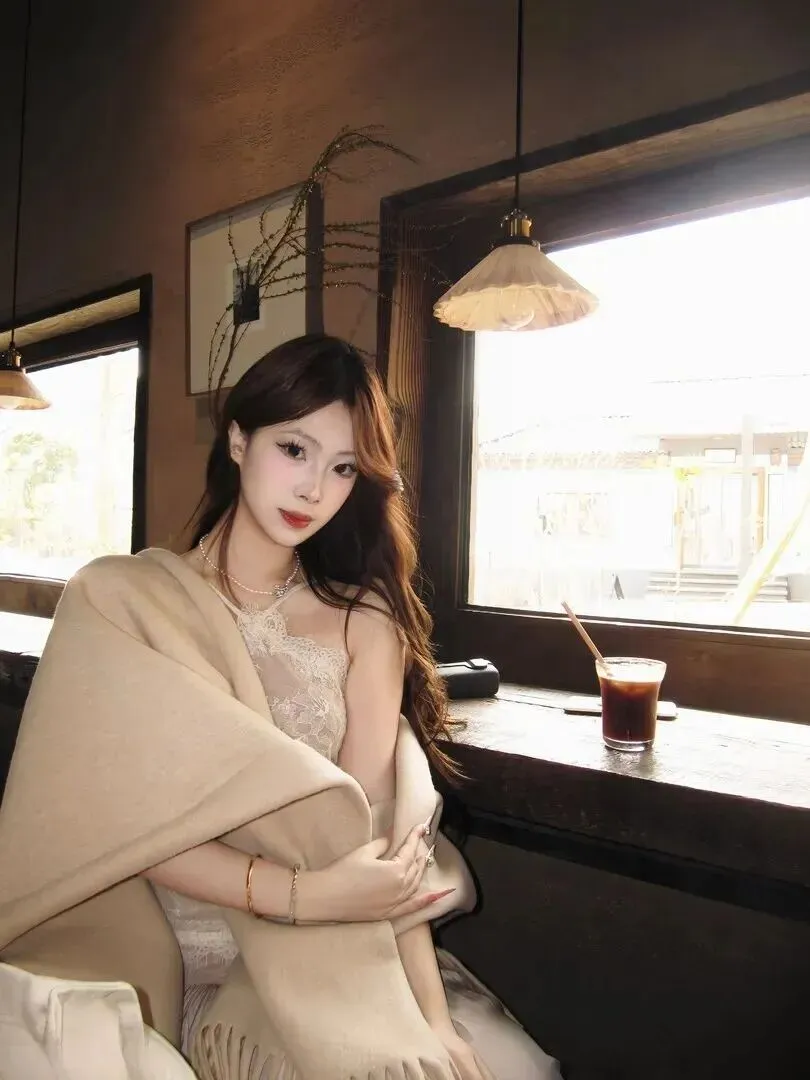 到了午后,阳光暖暖照进来,穿搭也得换点轻盈的。穿上一件米白色的蕾丝吊带外套再穿上一件浅卡其色的羊毛大披肩,流苏边上动了两下。她坐在窗户旁边,手上好像握着一杯冰咖啡一般的感觉就出现了。蕾丝精致、披肩柔软地组合在一起,温柔里藏着一丝小性感,适合约会或者闺蜜午后茶会。