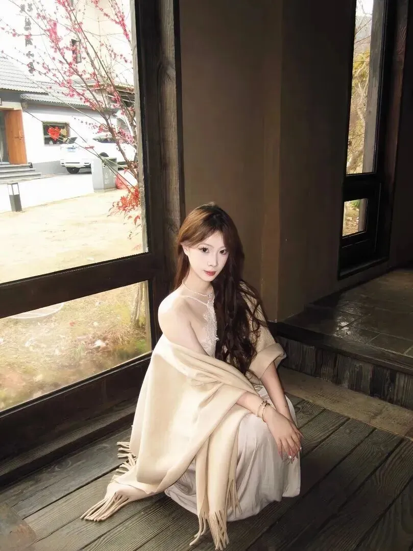 中式风格的场景是有温度的。女孩穿着一件米白色挂脖蕾丝上衣、浅米色披肩、佩戴珍珠项链的木质地上的女孩坐着。挂脖设计给人颈部较长的感觉,披肩流苏有很好的垂感,与古朴的背景配合得当。这样的一种穿着方式既温柔又带有一种气质,很适合走园林或者拍文艺照使用。
