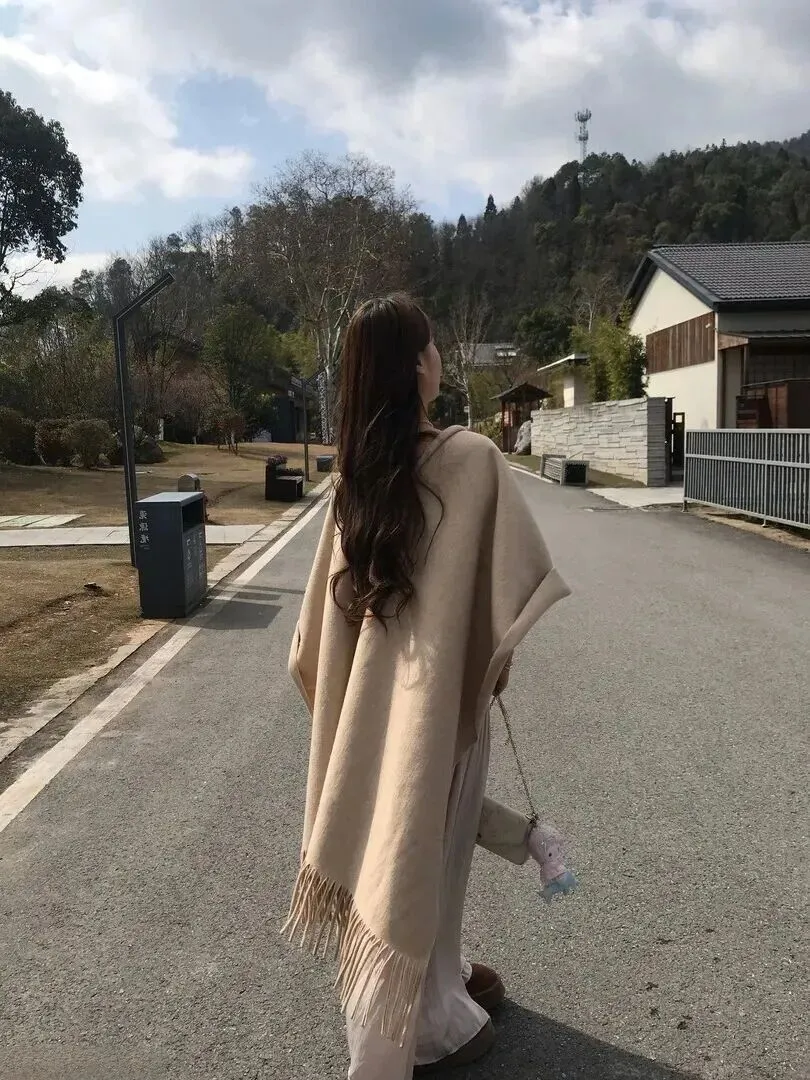 背影也会变花样玩,女孩把米杏色流苏披肩和米白色棉麻长裙穿在一起,用裸粉色细高跟。披肩流苏在风中飘动的时候,侘寂风空间里的浪漫气息就更加强烈了。这身穿搭非常适合出门散步,在转身的一瞬间就被人们所注意到了。