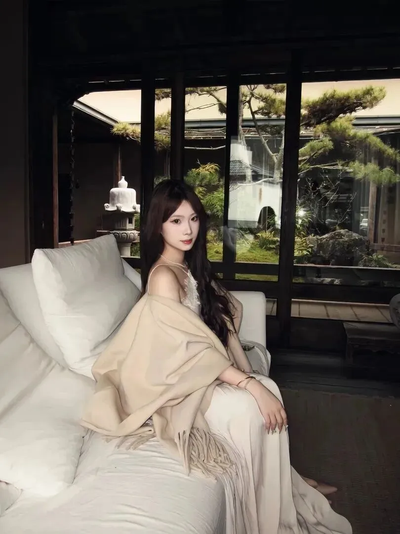 日式庭院的静谧感,穿搭也要与之相适应。以米白色蕾丝吊带、浅卡其针织披肩、缎面长裙为造型元素,女孩坐在床铺前,表情平静。把蕾丝的温柔同披肩的柔软、庭院里的雅致融合在一起,就成为下午茶的最佳配物。