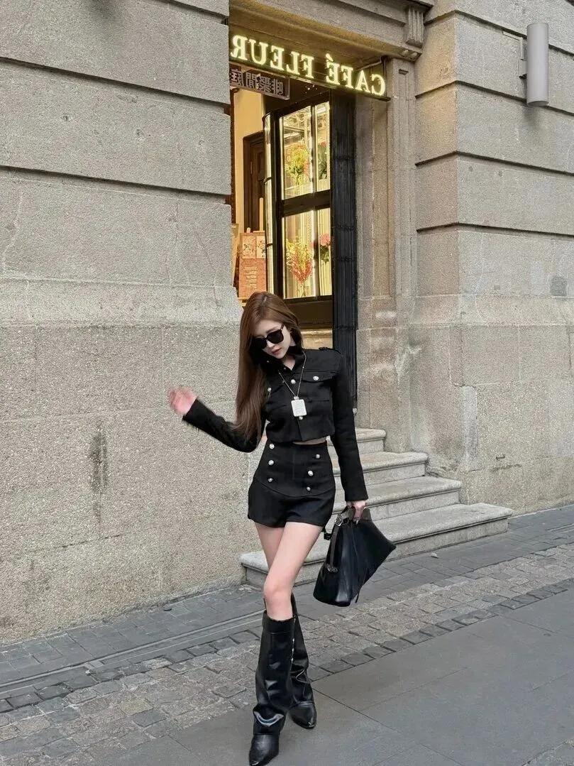如果你想穿得更加强势一些,黑色西装套装肯定行得通。该位女生身穿一件短款西服,肩部系有金属扣子,袖口带有饰物。裤子是高腰短裤,采用挺括的材料能给身材塑造出特别的瘦感。