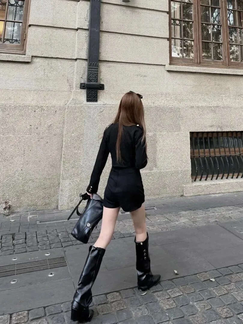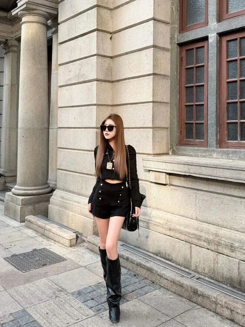 接下来这套对小个子女生特别友好。短款外套配上高腰短裤,一下子就把比例拉好了。外套是立领、扣子为金色、胸前有一个金色的链吊坠、白色正方形链条吊坠,十分浓烈。