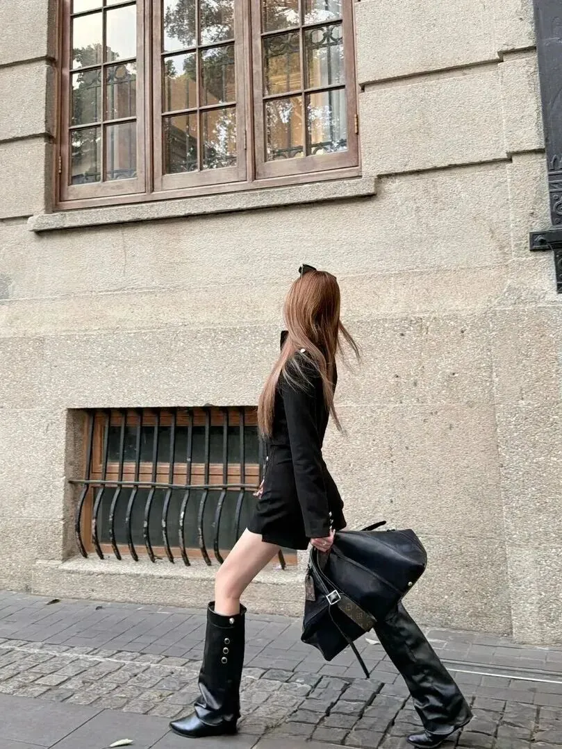 脚上是一双黑皮过膝长筒靴,亮晶晶的,不过高而已,特别显腿长。金领带系为颈圈形,朴素大方,类似一块。一套有范子且自由的组合方式适合日常使用。