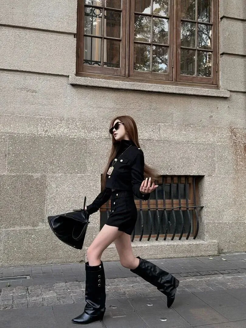 拍照姿势可以加分。蹲下拍更带感。穿高领毛呢大衣和紧身短裙裤的女人身上到处都是数不胜数的金黄色扣子,美到让人不能言喻。