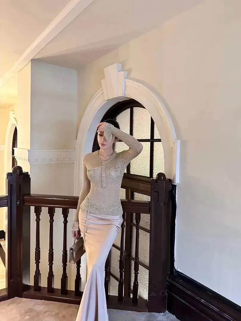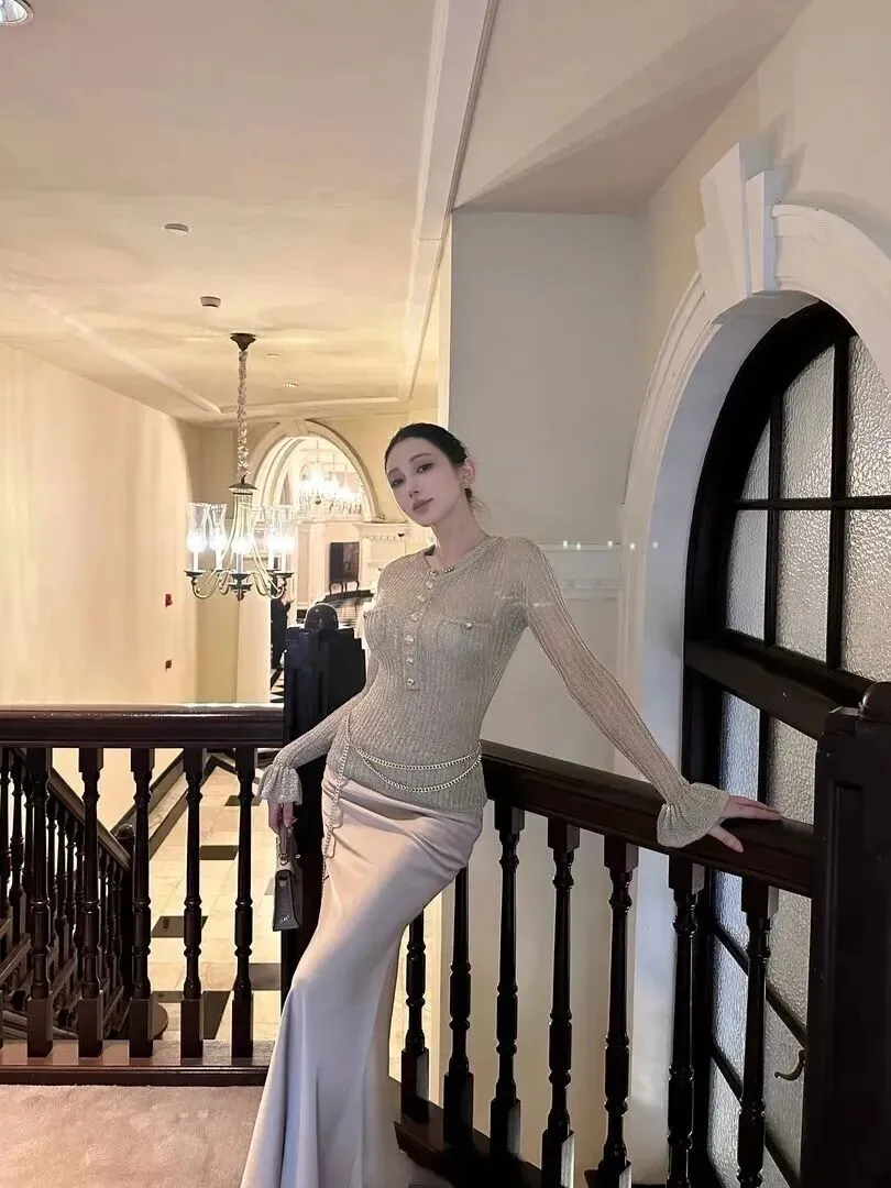 复古风格的楼梯间里浅金色针织上衣+香槟色缎面鱼尾裙+链条腰带,站在木质楼梯上,就回到了中世纪的欧洲古堡里,优雅高贵。