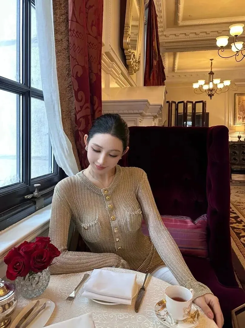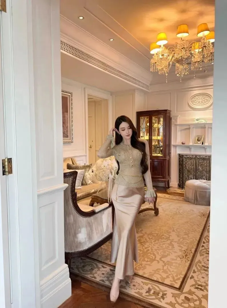 连豪华的浴室内穿的是香槟金色针织上衣、浅米色半身裙,提一只球形手拿包都显眼。适合拍照打卡的装扮是穿着得体,礼服。