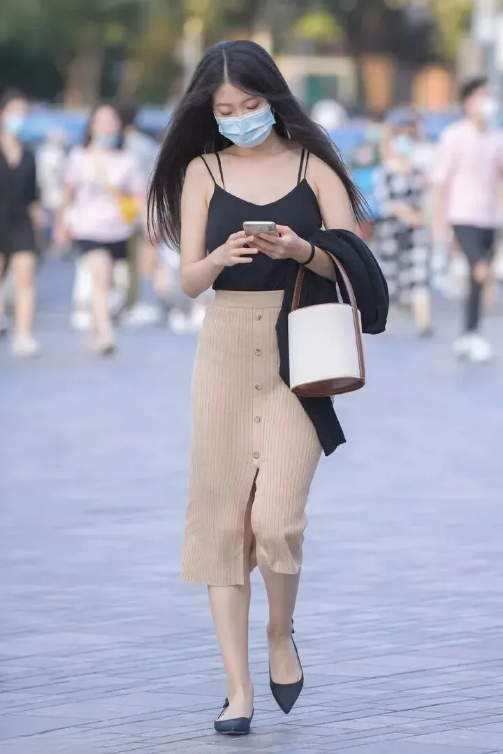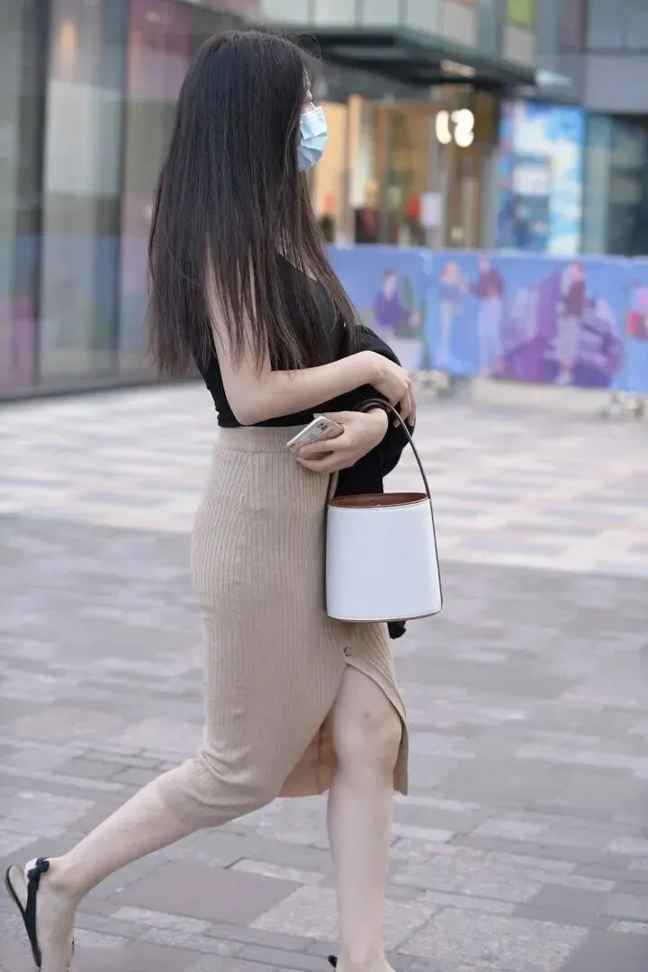 想要穿得有型,就得有几分机灵。这位小姐姐的着装特点就是裙摆处开衩到大腿处,露出右腿肌肤的一种性感而且又带有时尚味道的设计。