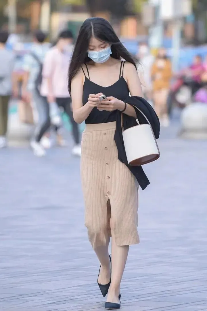 这身简单的款式非常有品位。黑色细肩带针织吊带背心带有明显的肩颈轮廓,两边的腰部也可以摸到。穿浅卡其色竖条针织包臀半身裙有很好的身形改善作用。脚上黑色圆带扣白色的丝绒夹趾凉鞋,小小的蝴蝶结。