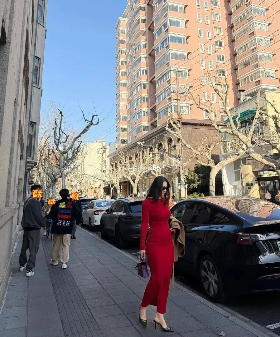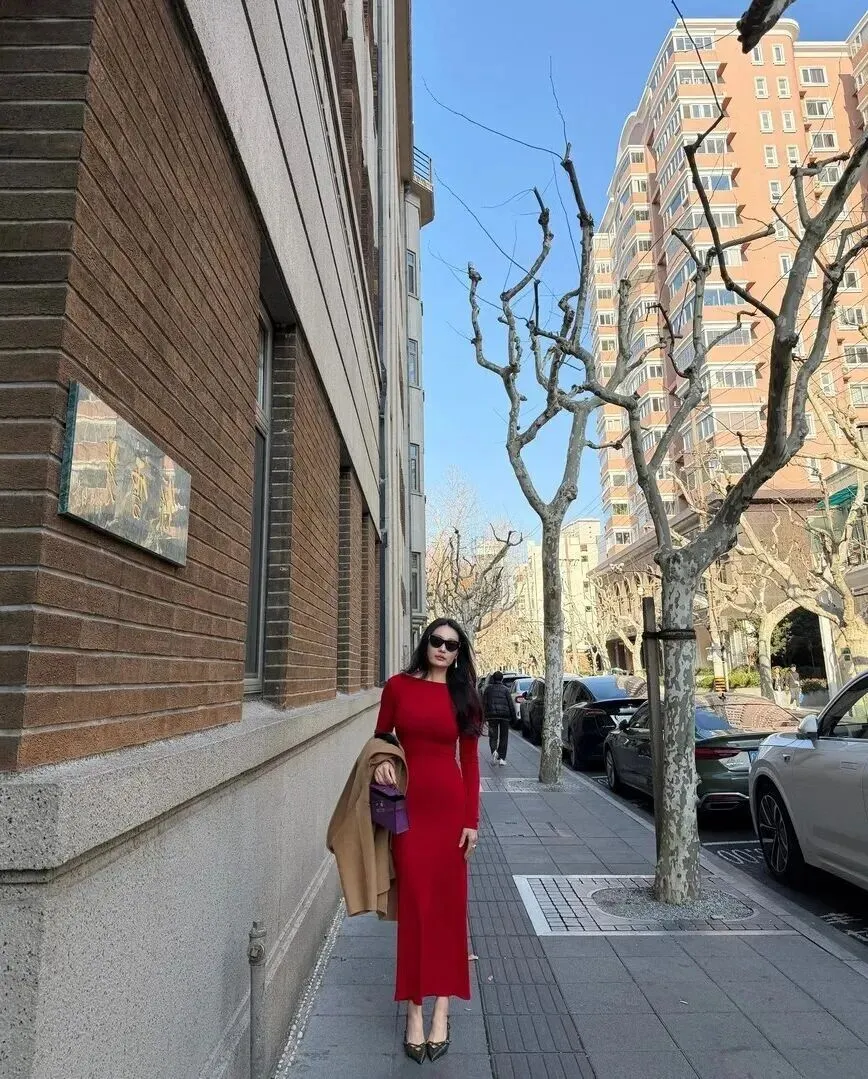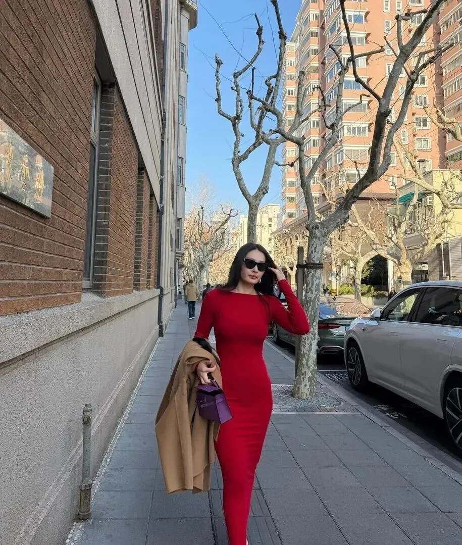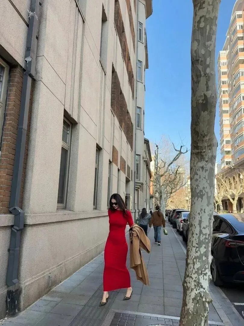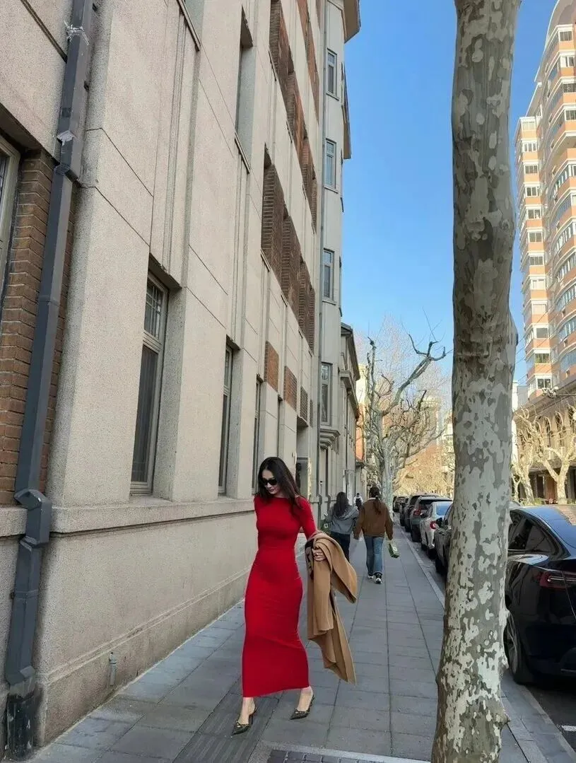 首先来看看她穿着的那条正红色的针织长裙。颜色太正,红得特别高级,一点也不俗气。裙子属于修身款式,可使身材线条得到体现却不会显得过于突出。从脚跟到脚踝,下部配一双黑色尖头细高跟,走路时裙摆轻微地飘动,非常优雅。针织面料软软的,贴身穿很舒服,又不会勒得慌。在秋冬里特别醒目,暖色调而且显白。戴着墨镜的她又多了几分清冷的气质,也多了一份甜美的、帅气的表情。