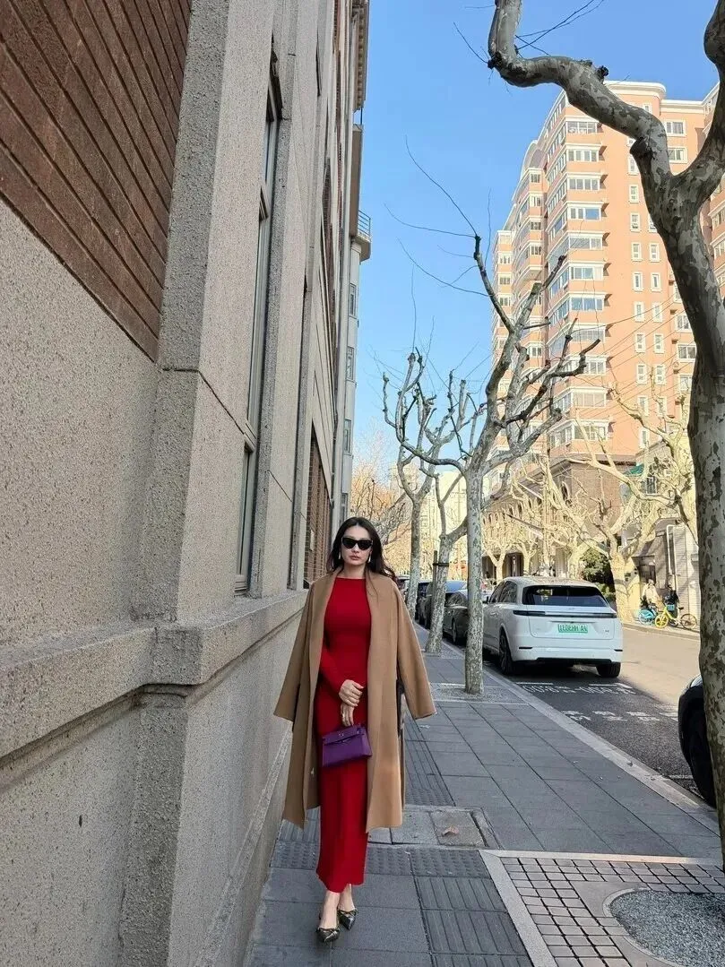 套用起来很实用的是一套。针织裙加上大衣,是秋冬季不出错的选择。红色系提气色,让人有精神。配饰数量少一些,几个亮点就可以了。她这样的穿着方式简单又高级,用墨镜、包包和鞋子进行点缀。姐妹们可以学起来,秋冬别再只穿黑色,试试红色,也许会有惊喜。