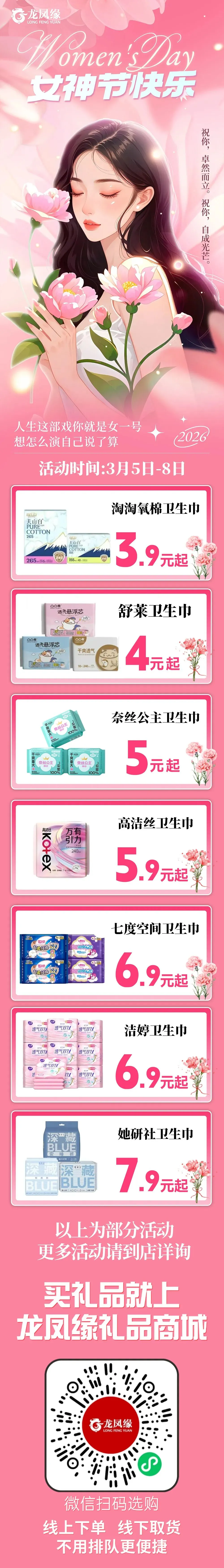 当前位置:首页>美女资讯>【龙凤缘】女神节专属宠爱,卫生巾全场3.9元起!囤一次,省一年!