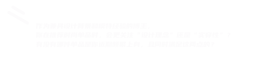 推荐时尚单品时,我会分场景考量:日常穿搭优先看重实穿性,舒适、耐穿,适配日常生活场景是基础;派对、穿搭分享这类特殊场合,则可以侧重设计感,这样能够更好地彰显出自身的风格与个性,最理想的状态当然就是实穿性与设计感二者兼顾啦~