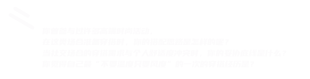 参加时尚活动时,我的搭配一般会选择活动品牌的全套服饰。如果社交场合的穿搭需求和个人舒适度冲突,我肯定会优先满足穿搭需求。印象最深的是去海拉尔参加活动,零下20°的天气我依旧穿了晚礼服,既贴合场合又特别出片,我就是一生追求出片效果的中国女人!