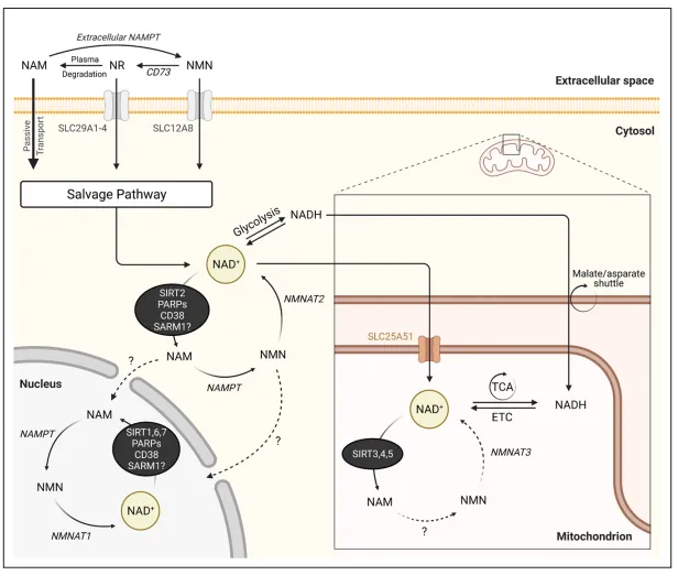 由于NAD+的亲水性、正电荷及分子量较大,无法通过被动扩散穿过质膜。因此,哺乳动物细胞需摄入NAD+前体进行细胞内合成。其中,烟酰胺和NA(烟酸)因分子量最小且膜通透性最高而成为主要转运形式。NR(烟酰胺核苷)通过平衡核苷转运蛋白家族成员进入细胞。NMN(烟酰胺单核苷酸)的转运机制曾被认为需经CD73(外核苷酸焦磷酸酶/磷酸二酯酶)去磷酸化为NR,但近期发现肠道特异性载体SLC12A8可作为NMN转运体。因此,未来研究需进一步阐明心血管系统中NAD+及其前体的转运机制。