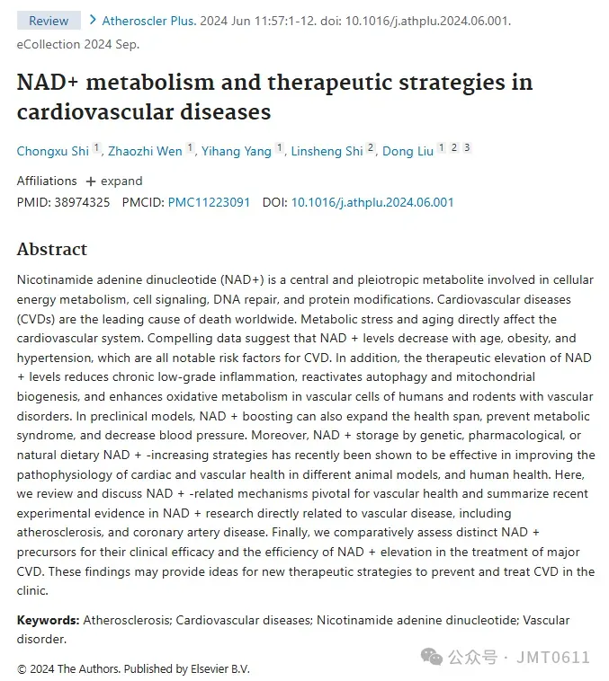 以下为具有直接预临床证据支持NAD+生物合成增强具有治疗潜力的心血管疾病清单: