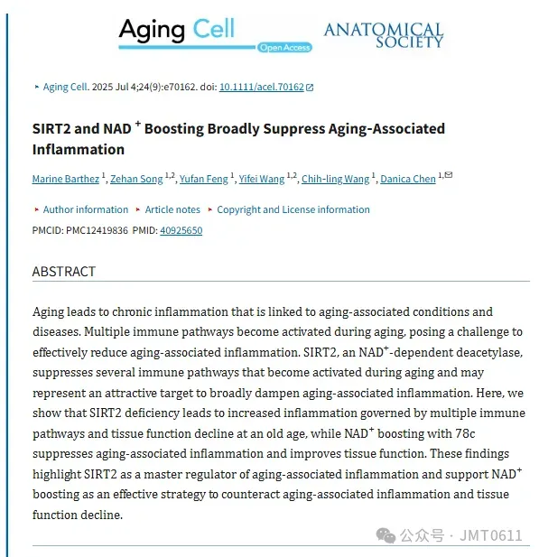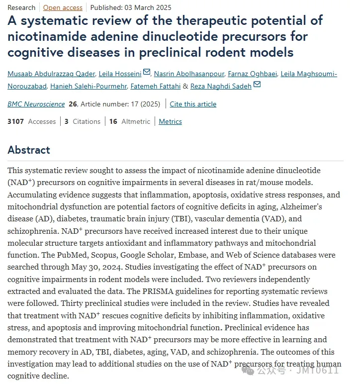 动物模型:补充NAD+前体减少老年小鼠脑内炎症,改善记忆功能(2020年《Nature Aging》)。