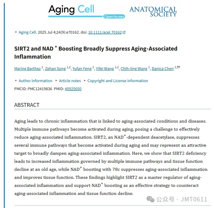 炎症抑制:NAD+通过激活SIRT1抑制NF-κB通路,减少炎症因子释放,延缓慢性炎症导致的组织衰老。