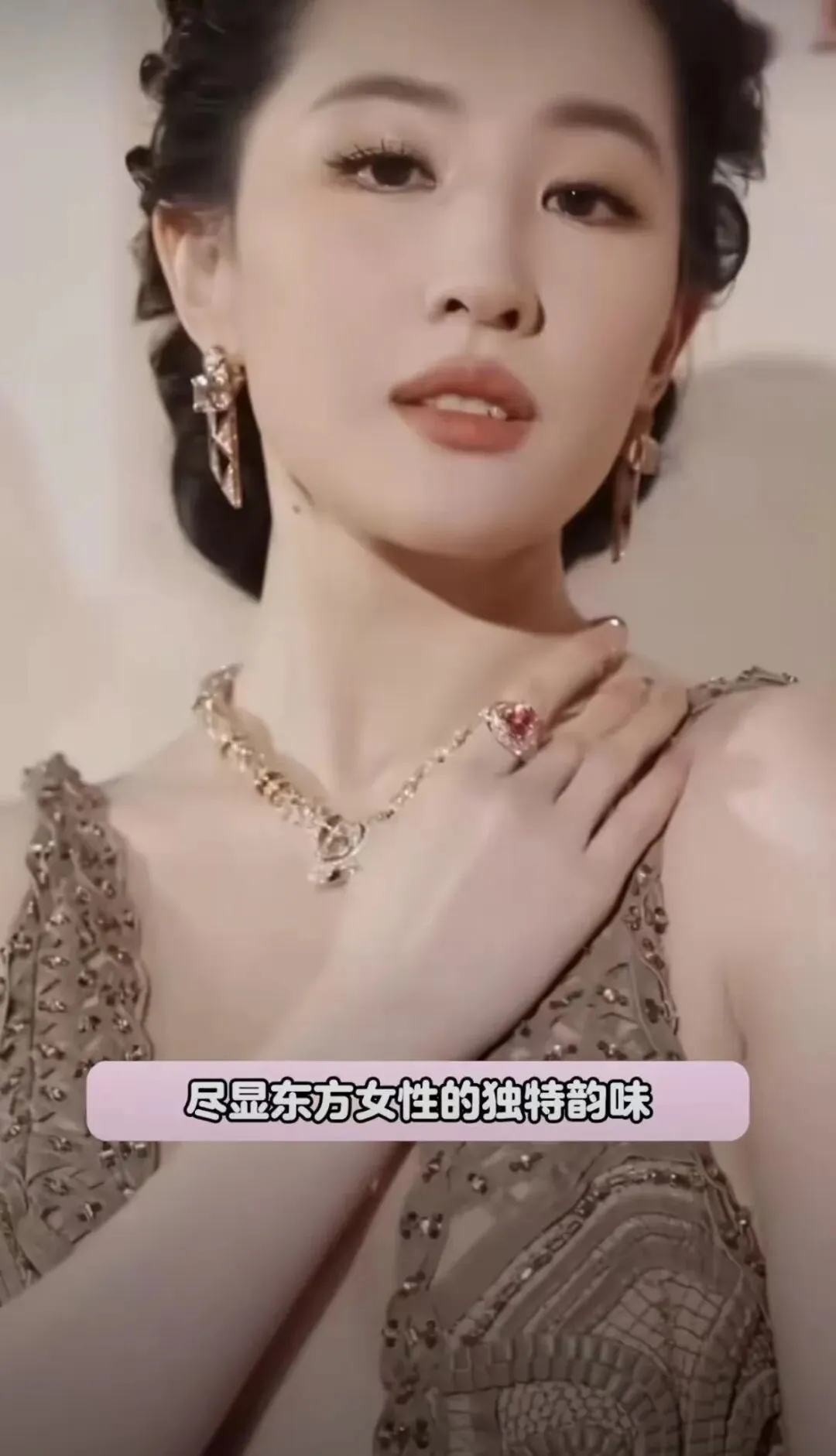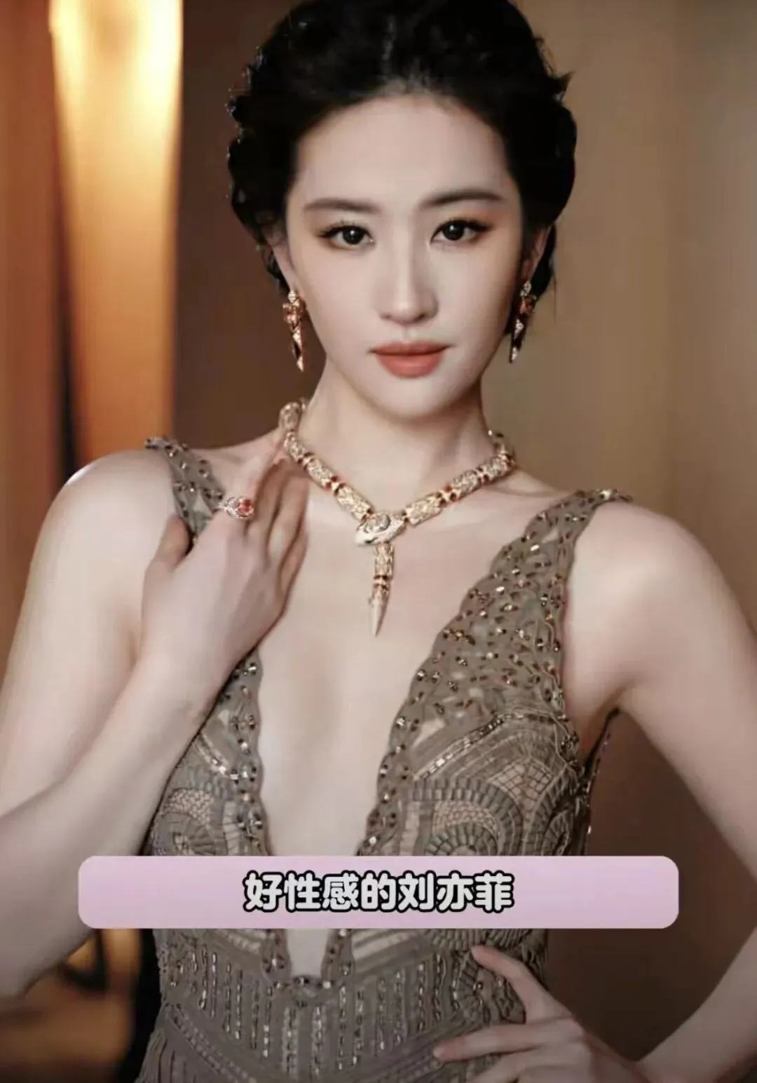 刘亦菲穿的深咖色流苏裙,2.3米水晶裙摆走路带风,配着灵蛇珠宝,像从敦煌壁画里走出来的仙。