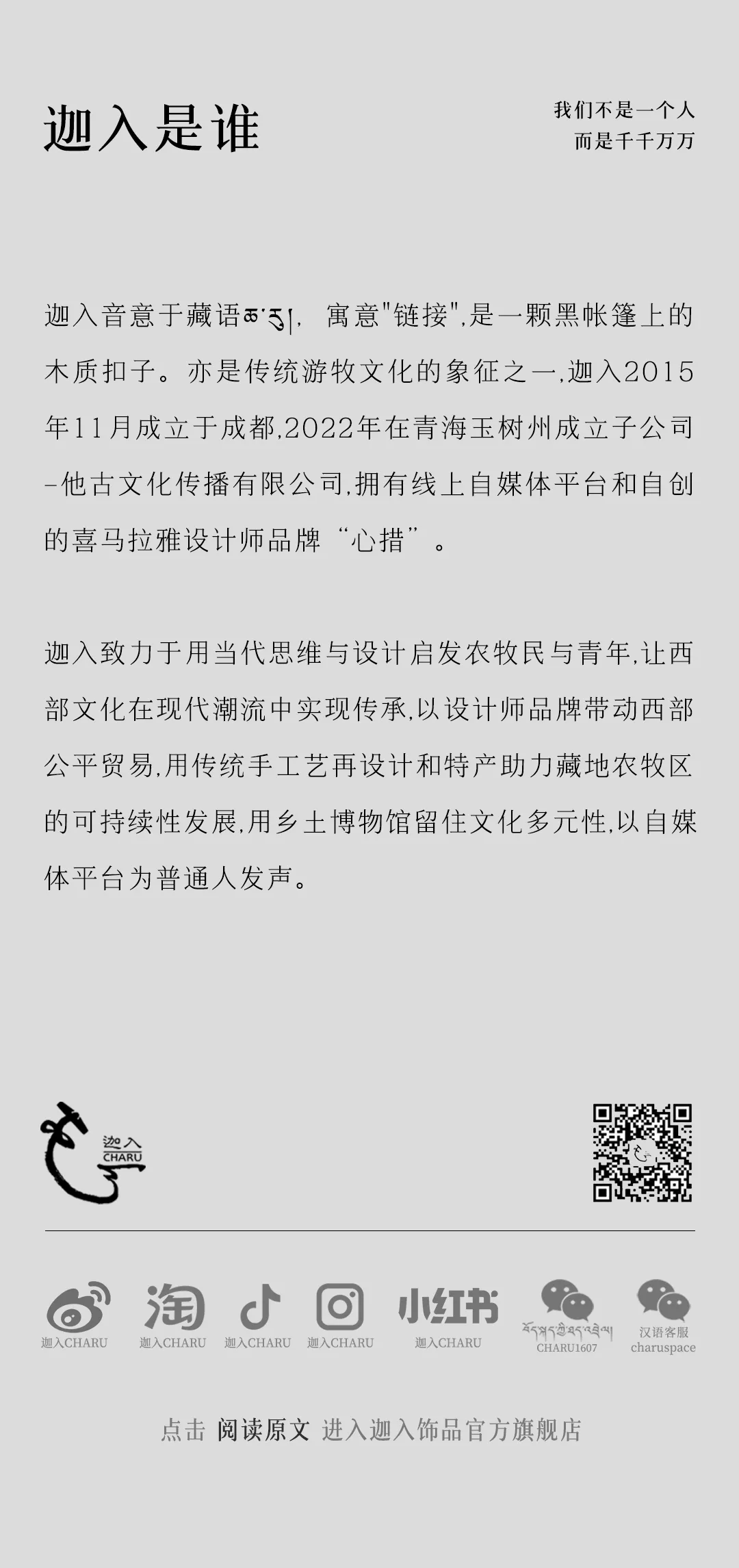迦入音意源自藏语ཆ་རུ།,寓意“链接”,是黑帐篷的木质扣子,也是藏族传统游牧文化的象征,品牌2015年11月创立于成都,2022年在青海玉树设立子公司他古文化传播有限公司,旗下拥有线上自媒体平台及心措(喜马拉雅饰物)、山又(藏毯)、她他利(藏地针织)、山惢(黑陶)四大品牌。