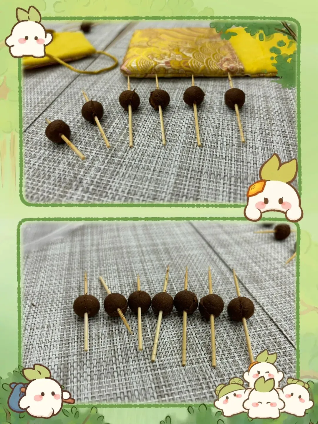 制作环节,大家跟着老师的步骤把软乎乎的药泥反复揉圆、用模具压成饱满的珠坯,再用牙签小心穿好孔······