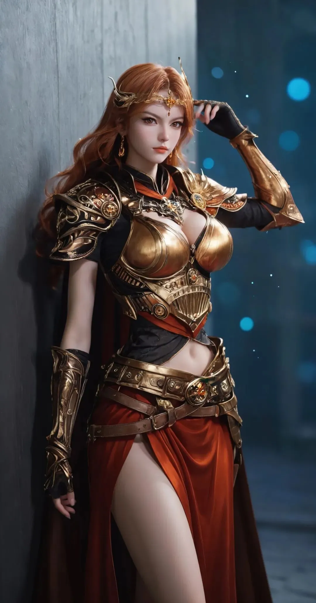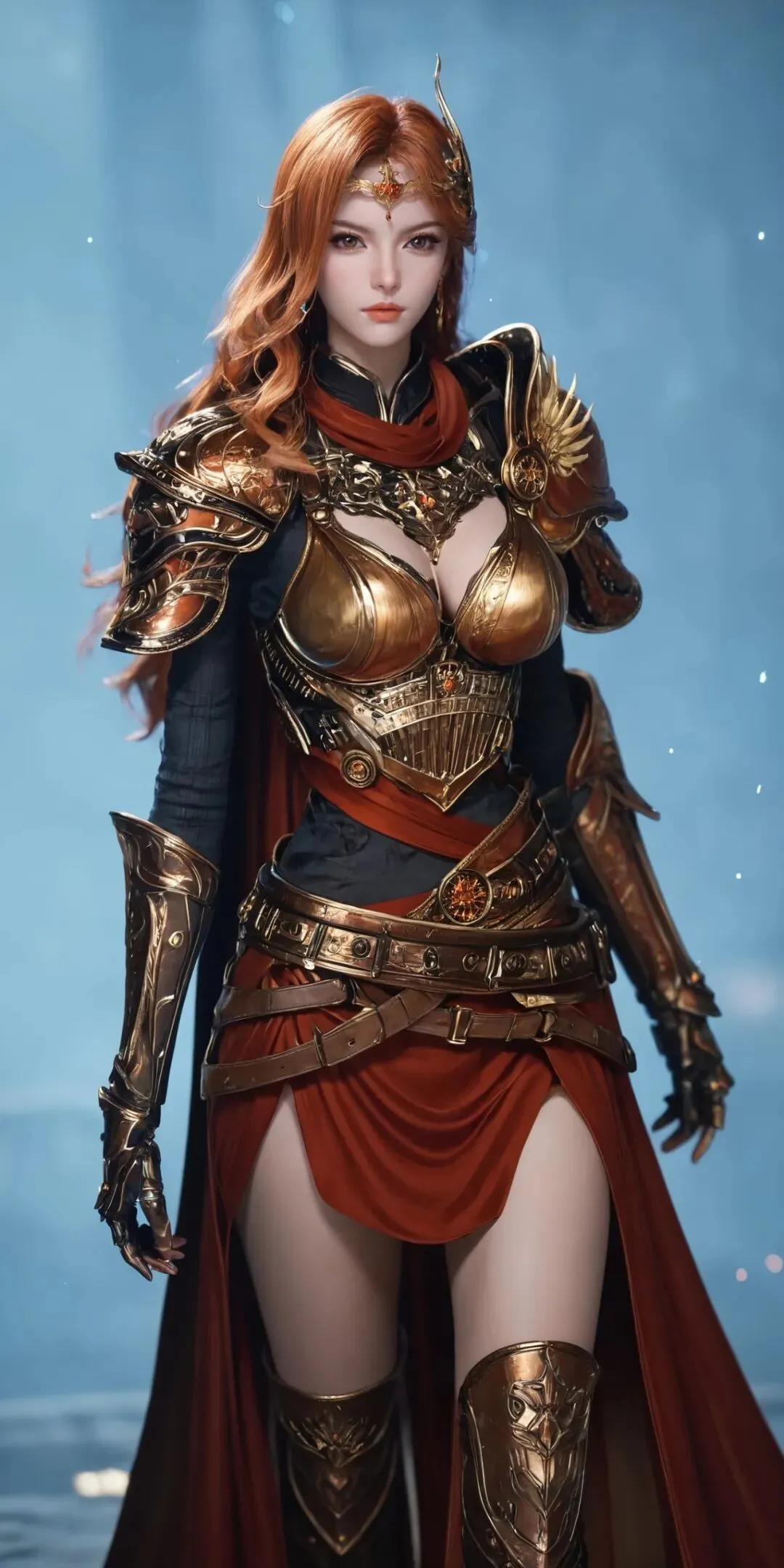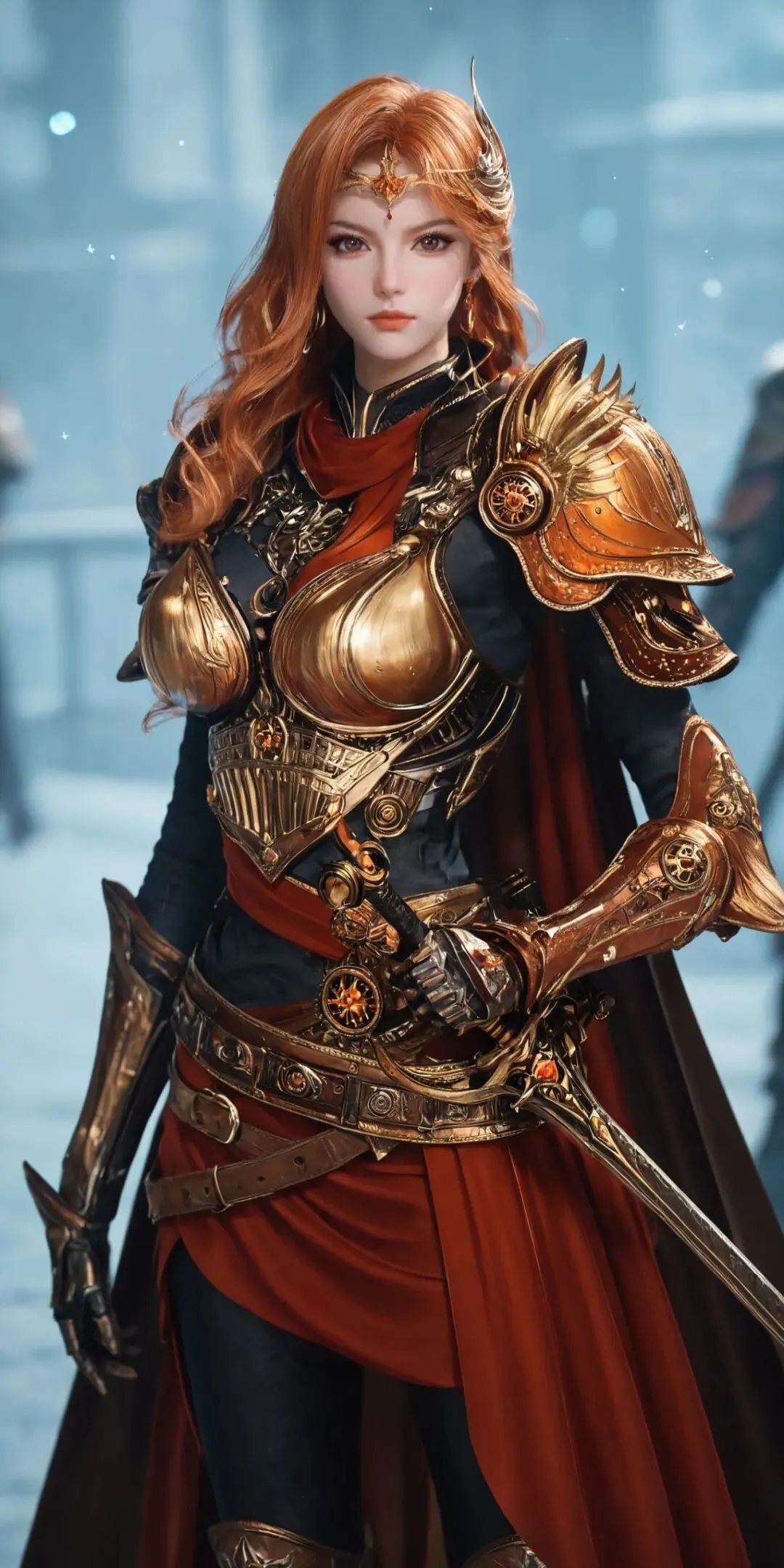 最亮眼的当属这身橘色战甲!战甲是贴身设计,不笨重却超有气场,完美贴合身形还不影响战斗灵活性。外搭一件宽大披风,随风飘动时瞬间拉满统帅威严,走路都带风。发型也超利落,高马尾束得干干净净,搭配护额和中分斜刘海,把干练果断的气质拿捏得死死的。再配上一把长剑,手持兵器的瞬间,将军的气场直接溢出屏幕。