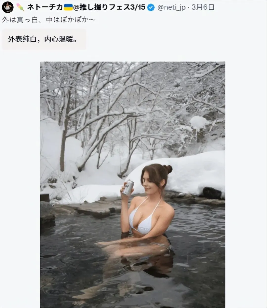 时间是3月初,她在社交平台上发了一张图:雪地温泉,热气氤氲,她穿着比基尼,手里拿着一罐饮料,整张照片的感觉就是典型的“反差美学”。