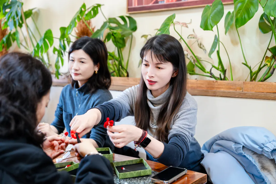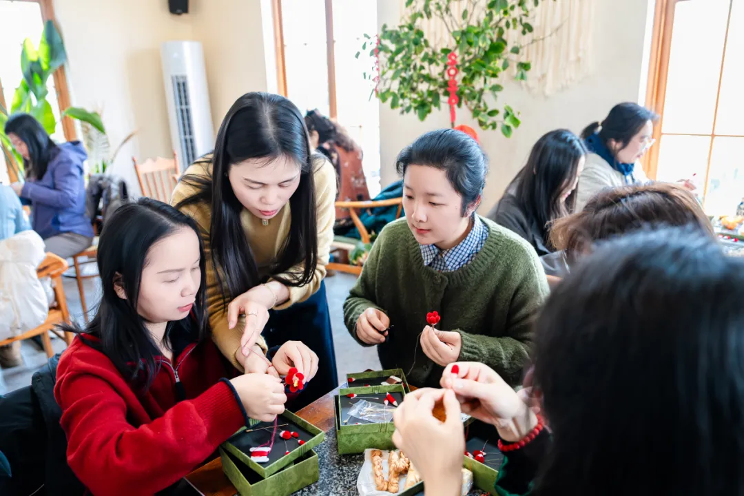 随着老师细致的分步演示,平日里在职场中雷厉风行的女神们,纷纷化身温婉的手艺人。现场氛围热烈而有序,三位老师穿梭在席位之间,手把手地传授传花等核心技巧。