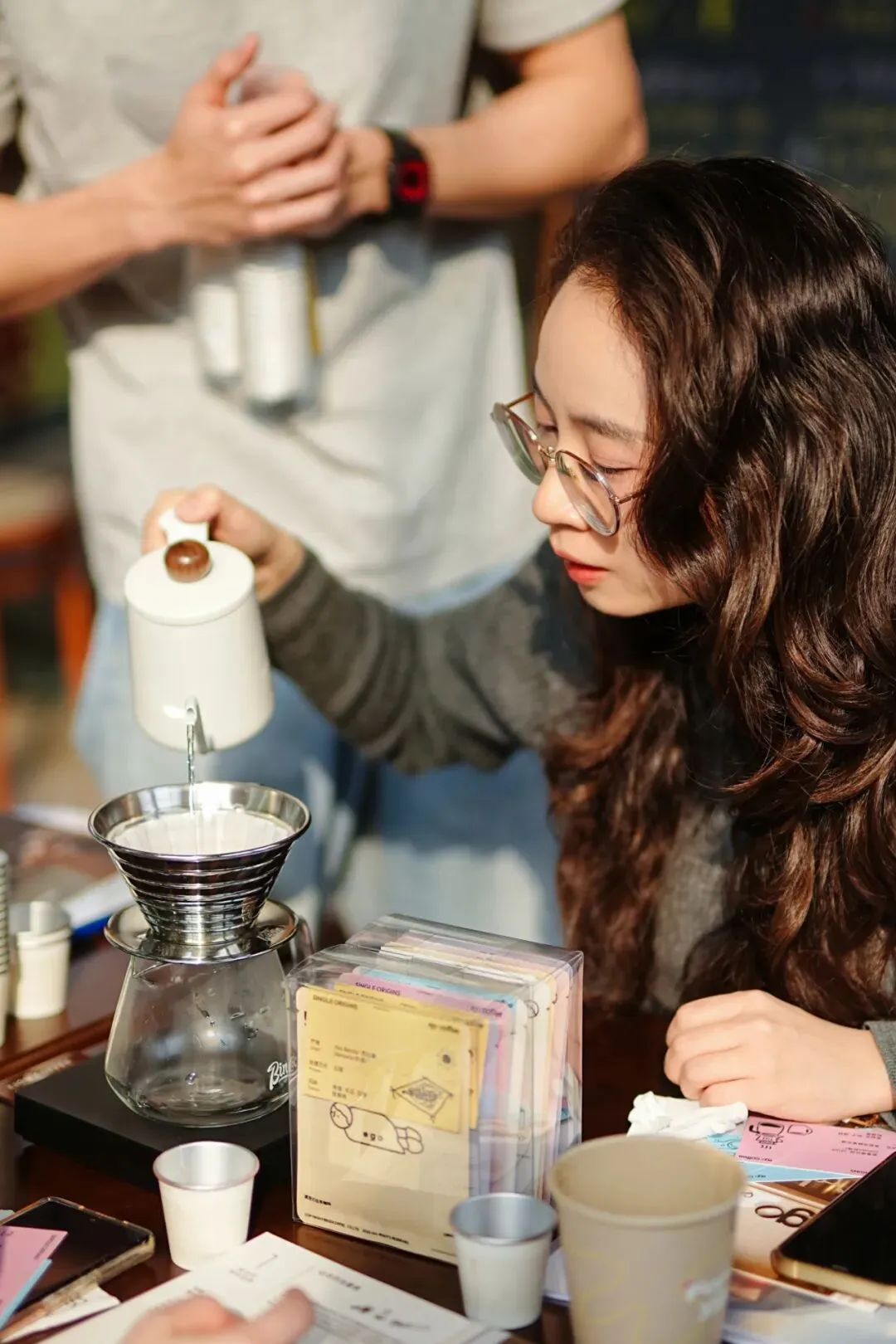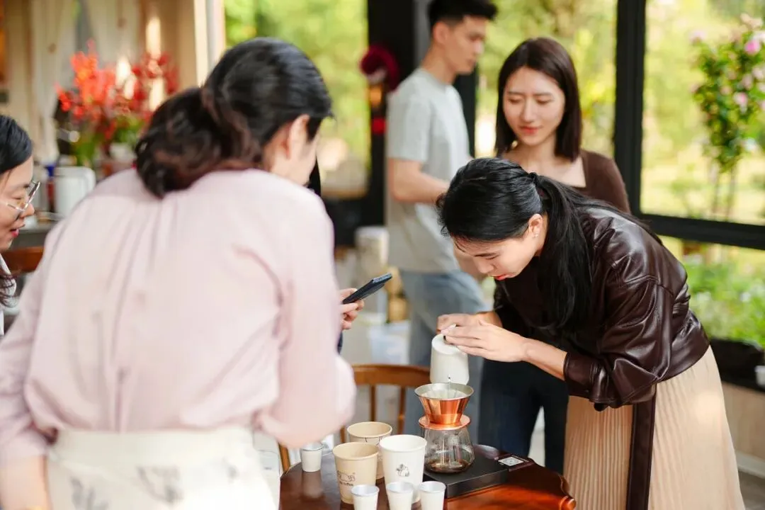 在实操体验环节, 参与者在讲师的指导下亲手尝试手冲咖啡,感受水流与粉层交融的节奏,体察时间与温度赋予风味的层次变化。现场香气四溢,气氛轻松愉悦,大家一边品味醇香,一边交流心得,在动手实践中放松身心,也在细微之处感受生活之美。